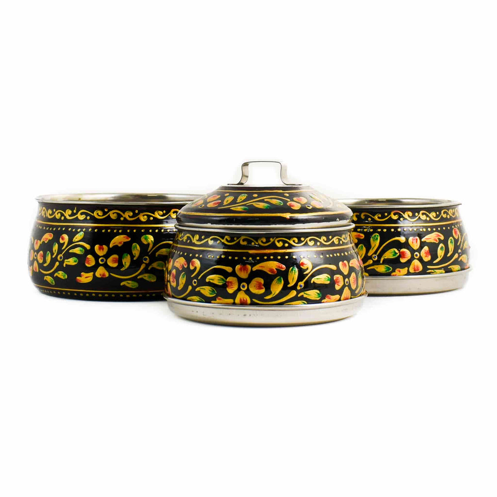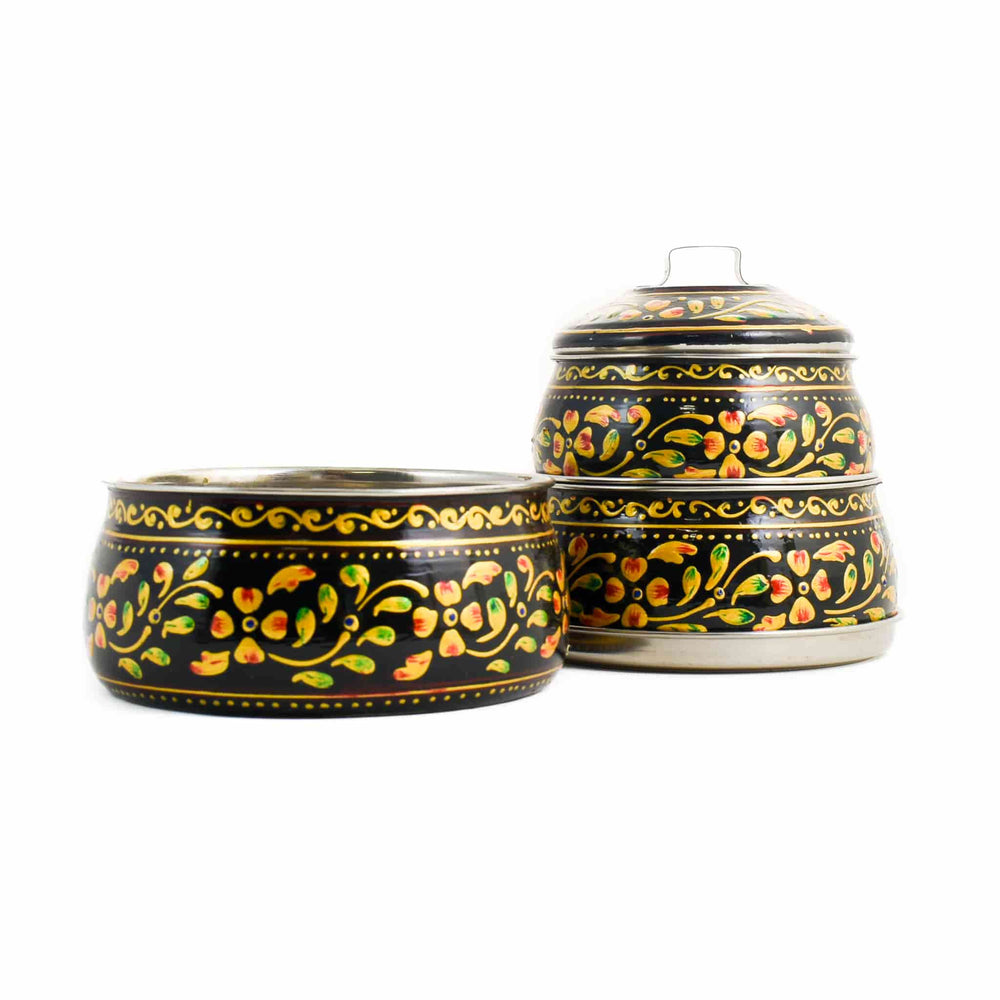 Hand Painted Three Tier Black Tiffin Tin, 1.5 Litre
