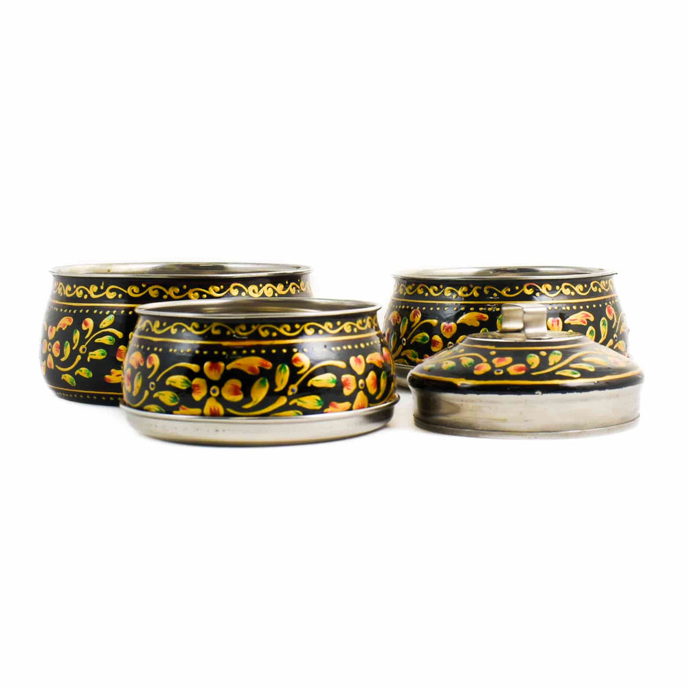 Crafted from stainless steel, the tins are durable, portable and reusable. The enamel coating is decorated with a traditional Indian motif in gold, red and green. The design is hand-painted by talented artisans, so no two are the same.