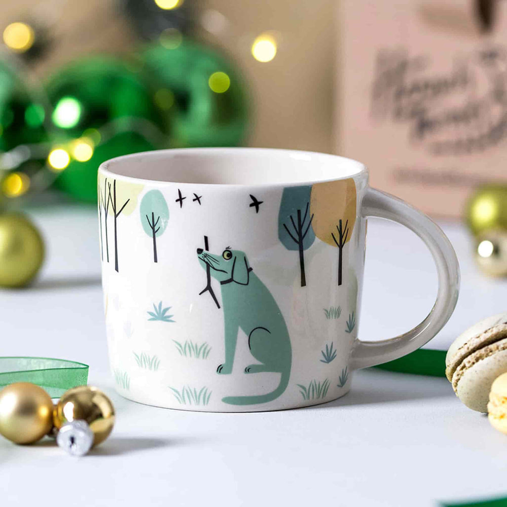 This dog mug is a lovely addition to your breakfast table. The graphic illustrations depict two dogs hunting for sticks in the forest. Muted shades of teal, orange and sage give the mug a calming, cosy look.