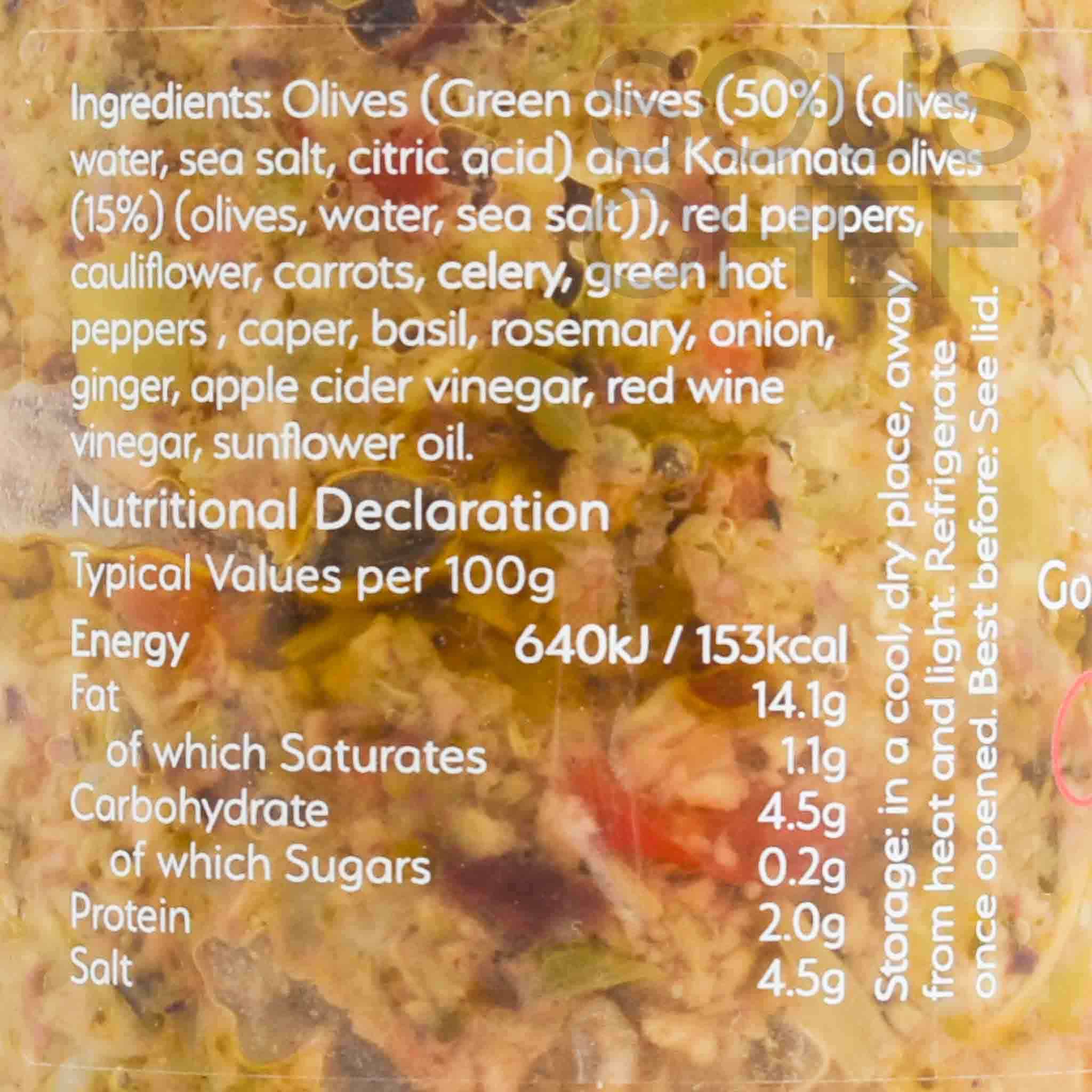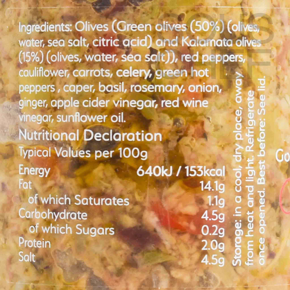 Product formulations and details may change. For the latest ingredients and allergen information always check product packaging prior to consumption. Ingredients: Olives (green olives (50%) (olives, water, sea salt, citric acid) and kalamata olives (15%) (olives, water, sea salt)), red peppers, cauliflower, carrots, celery, green hot peppers, caper, basil, rosemary, onion, ginger, apple cider vinegar, red wine vinegar, sunflower oil.