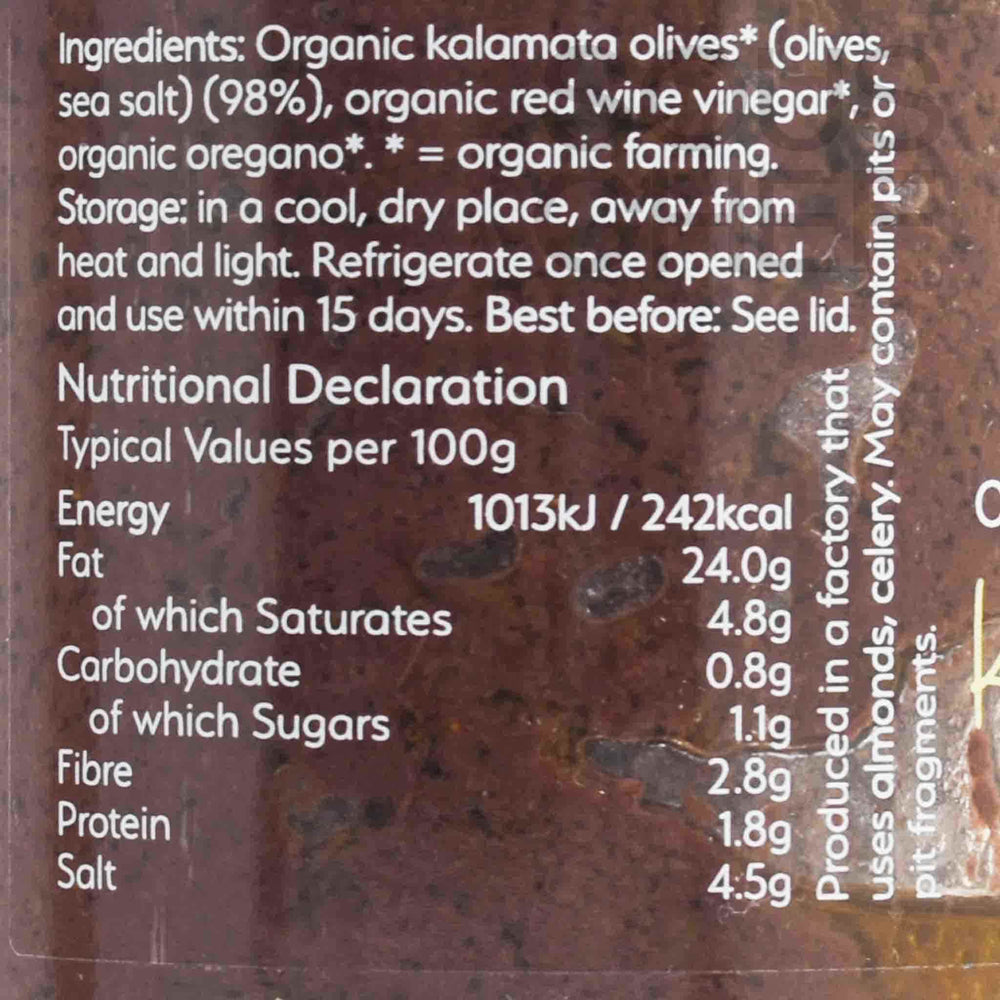 Product formulations and details may change. For the latest ingredients and allergen information always check product packaging prior to consumption. Ingredients: organic kalamata olives* (olives, sea salt) (98%), organic red wine vinegar*, organic oregano*. * = organic farming.