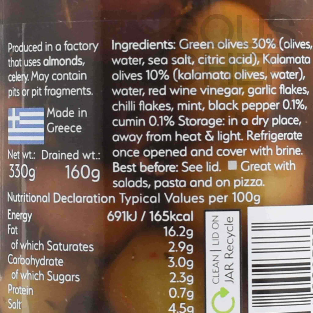 Product formulations and details may change. For the latest ingredients and allergen information always check product packaging prior to consumption. Ingredients: Green olives 30% (olives, water, sea salt, citric acid), kalamata olives 10% (kalamata olives, water), water, red wine vinegar, garlic flakes, chilli flakes, mint, black pepper 0.1%, cumin 0.1%