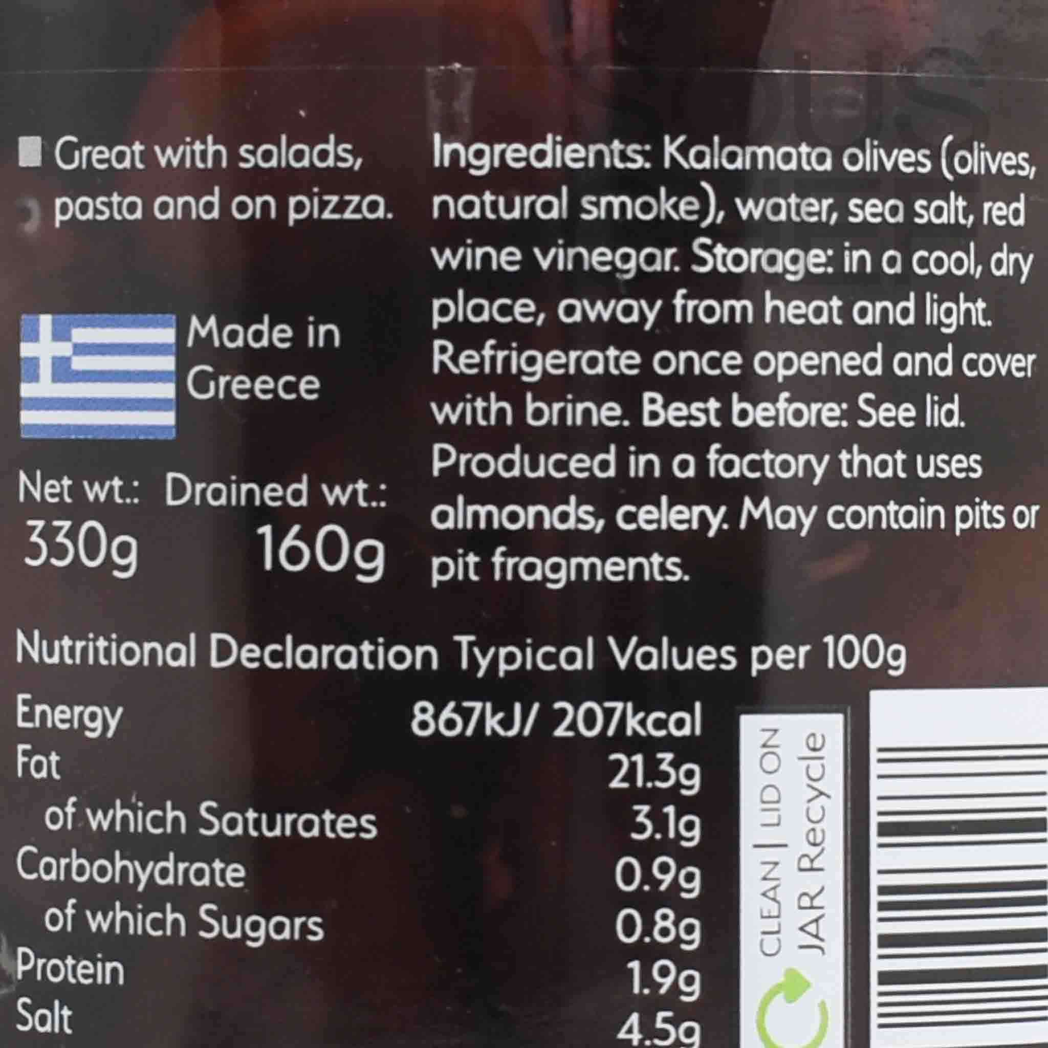 Product formulations and details may change. For the latest ingredients and allergen information always check product packaging prior to consumption. Ingredients: Kalamata olives (olives, natural smoke), water, sea salt, red wine vinegar.