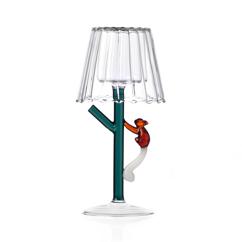 The tealight holder is made from flame-worked borosilicate glass. A little brown squirrel is climbing the dark green stem. Inspired by nature, this candle holder is a playful addition to any room.