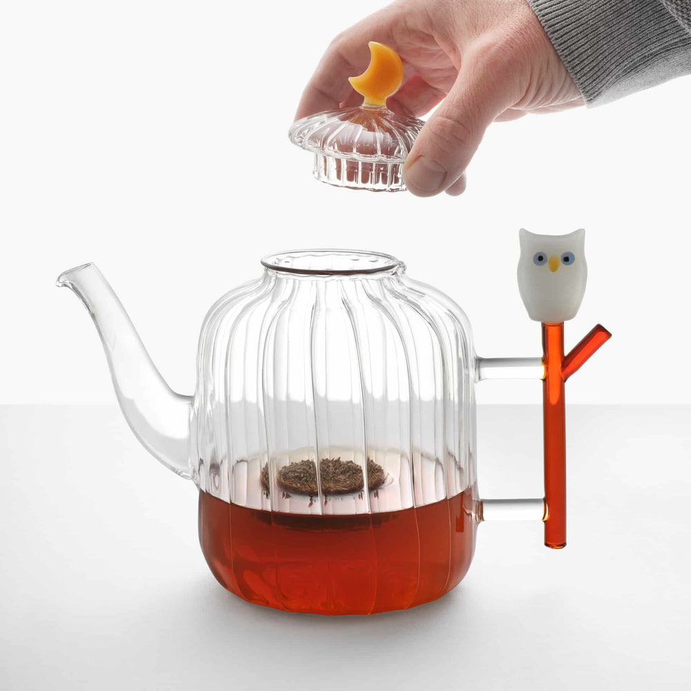 Serve tea in style with Ichendorf Milano’s owl and moon teapot. Handmade and flame-worked, it has a fluted glass body and slender pouring spout.