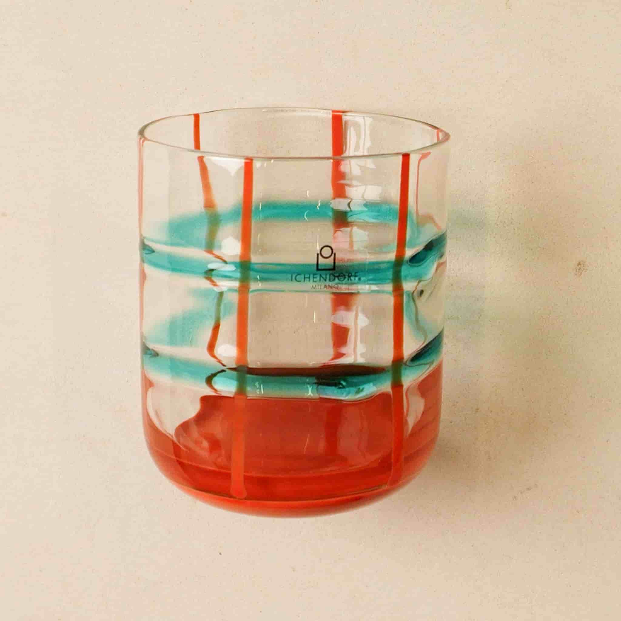 This orange and teal patterned tumbler is perfect for cocktail hour. Produced by Ichendorf Milano, it features irregular stripes in burnt orange and ocean blue. The base of the tumbler is also orange, as if it has been dipped in paint.