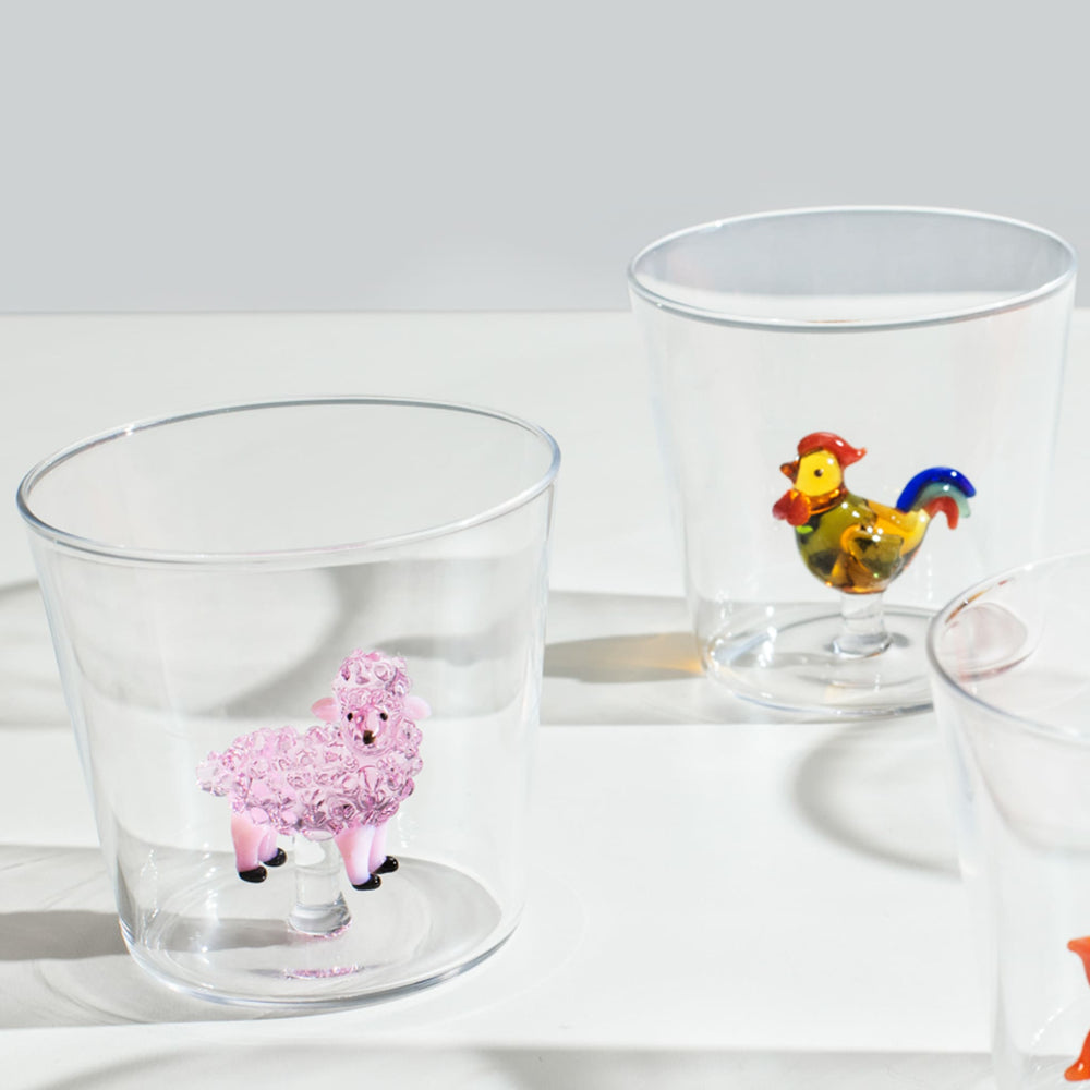 The glass is part of the Animal Farm collection, designed by Alessandra Baldereschi. Each piece features a different animal figure. Choose your favourites to bring a touch of fun to mealtimes.