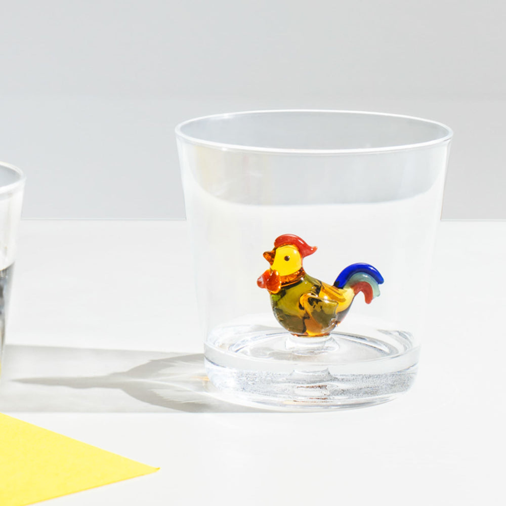 The tumbler is made from durable borosilicate glass. Set inside is a yellow rooster with a blue tail feathers and red comb. You can almost picture him strutting around the farmyard.
