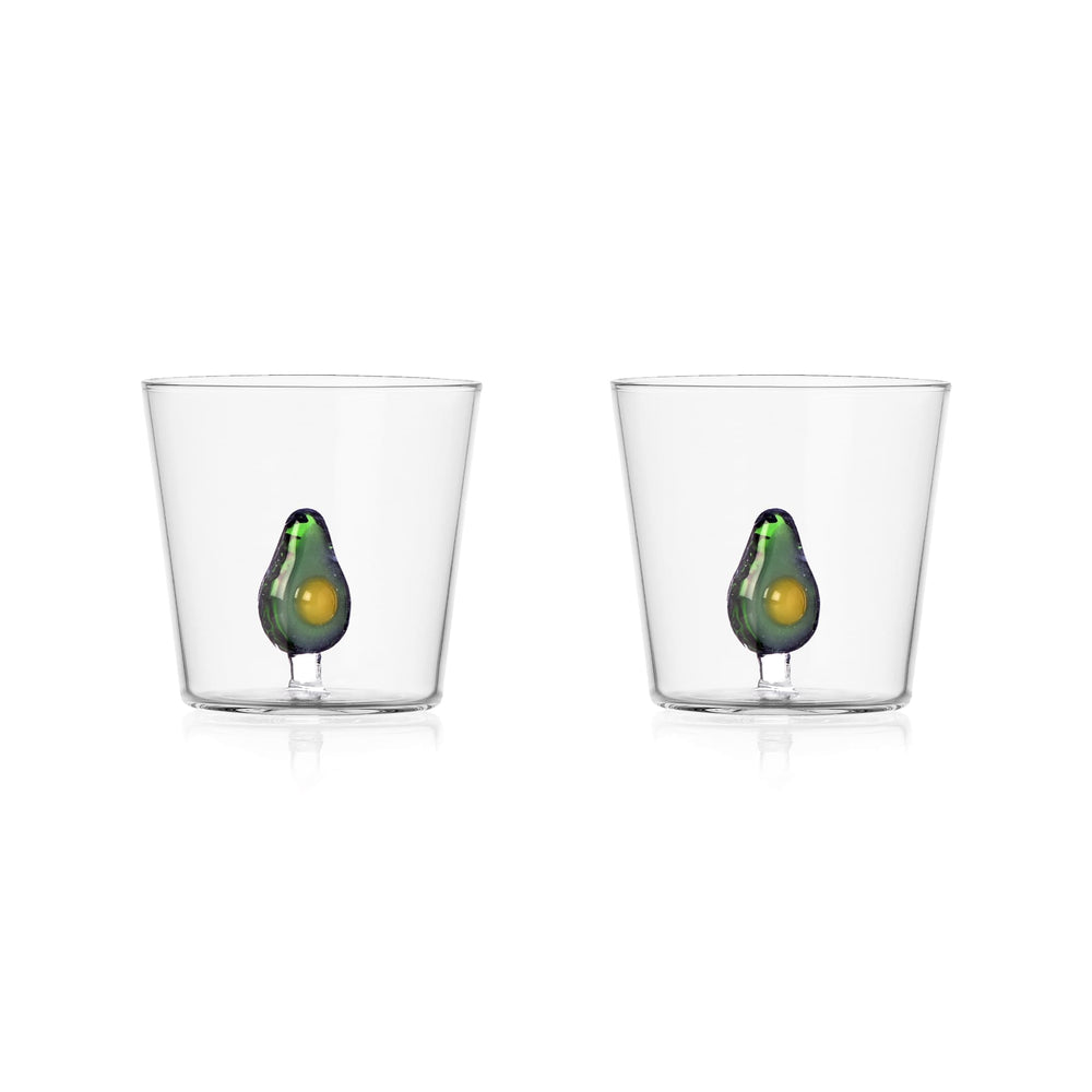 Fill Ichendorf Milano’s avocado tumblers with fruit juice or gazpacho. As you drink, you will reveal a little avocado suspended inside the glass. The deep green fruit has a golden stone at its centre.