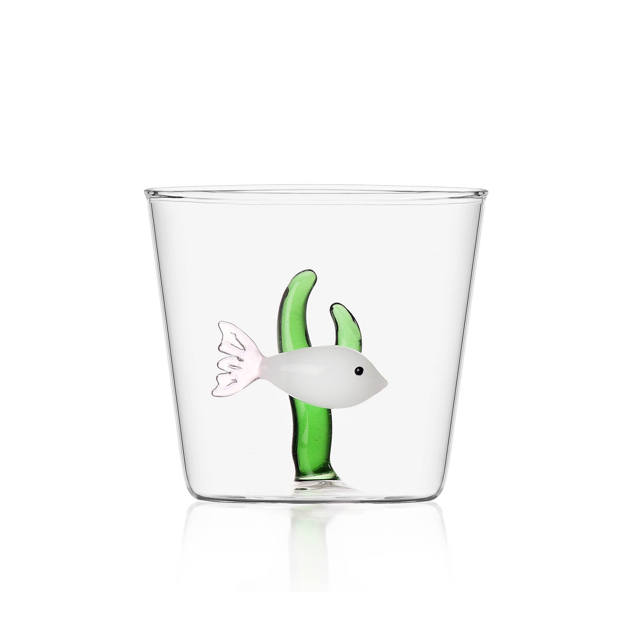 Each tumbler is handmade from flame-worked glass. Inside, you’ll find a glass fish swimming beside colourful coral. The fish are all different colours so guests can easily identify their glass.