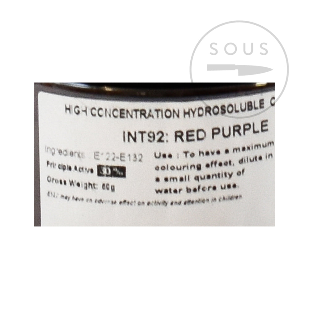 The intense red-purple food colour is water soluble. For maximum effect, dilute in a small amount of water before use. Recommended use is 1tsp of colouring in 1tsp water to colour 2kg of sugar. Contains 50g, or approx 60ml, or 12 tsp - enough for 24kg sugar.