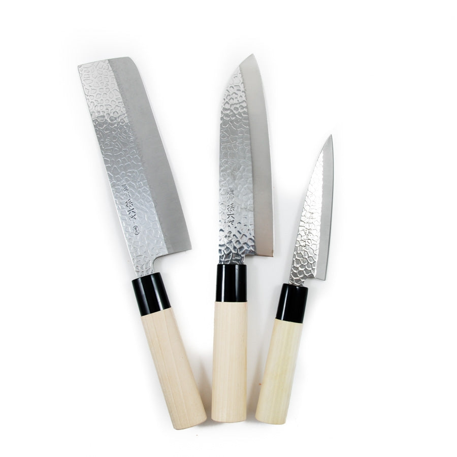The stunning Japanese knife trio lets you tackle all the main tasks required for making authentic Japanese meals. The hammered-finish set includes: