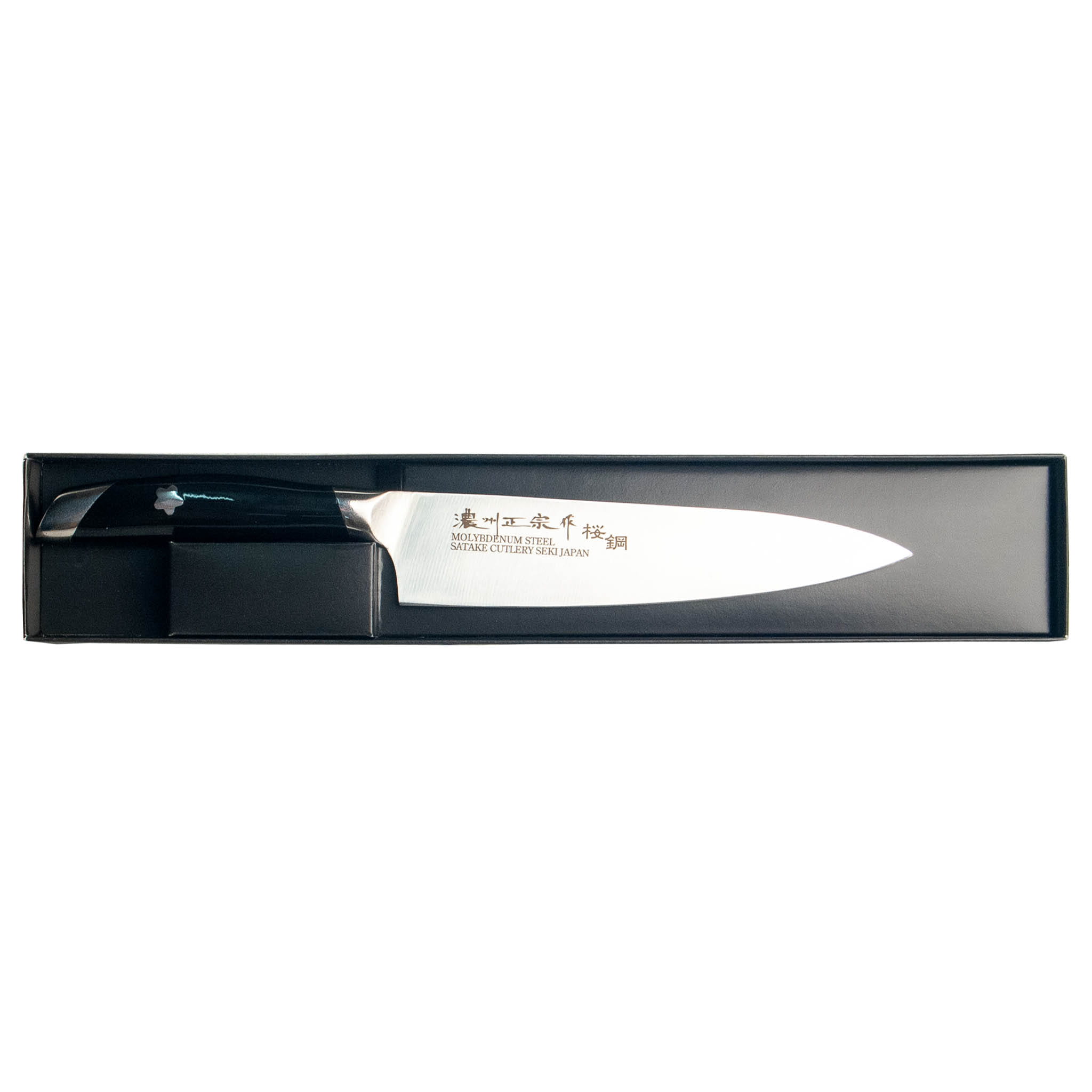 This Japanese Seki Gyuto knife is similar in function to a western-style chef’s knife, the Gyuto is versatile, but particularly useful for cutting meat and chopping. ‘Gyuto’ translates to ‘beef sword’. The shape and size of the blade with its tapered tip makes it suited to a ‘rolling’ action: the speedy French method of chopping where the tip of the knife remains on the board. The elegant black handle is curved for comfort. The 18cm blade is made from molybdenum Japanese steel, with a Rockwell scale of Härte HRC 55. Easy to handle, you’ll find yourself reaching for this knife again and again. Made in Seki City, Japan: world-renowned for their knife production, with a tradition dating back almost 800 years.