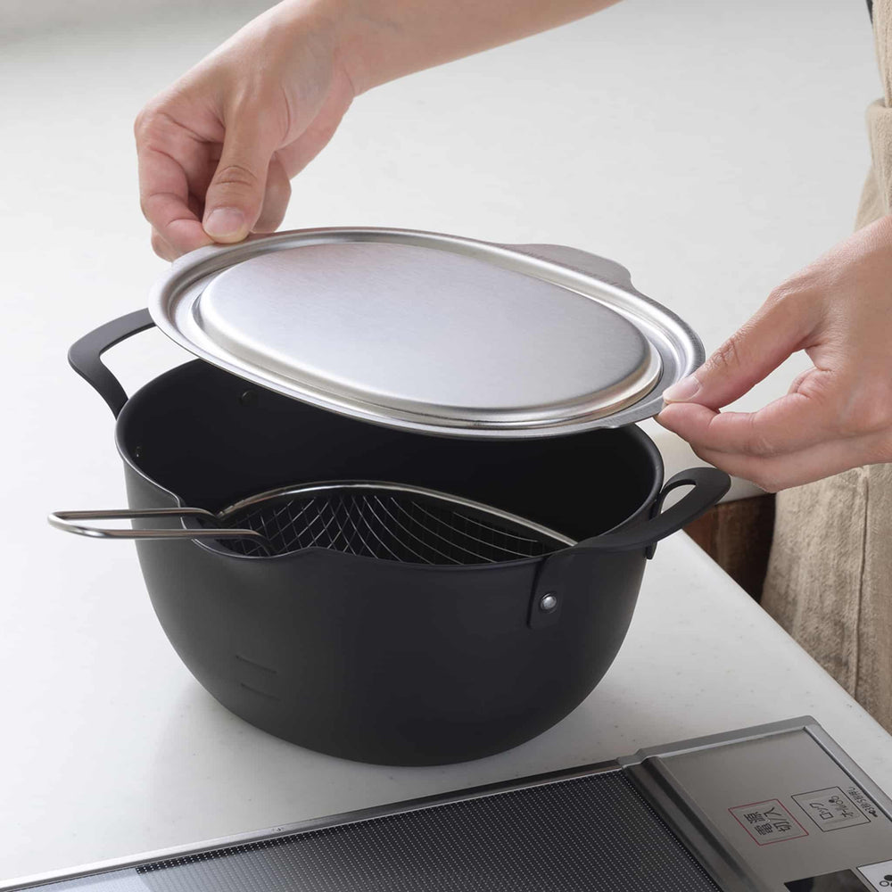 This stainless steel lid fits neatly onto this tempura frying pan. Use it to cover the pan while you’re frying to prevent oil splatters.