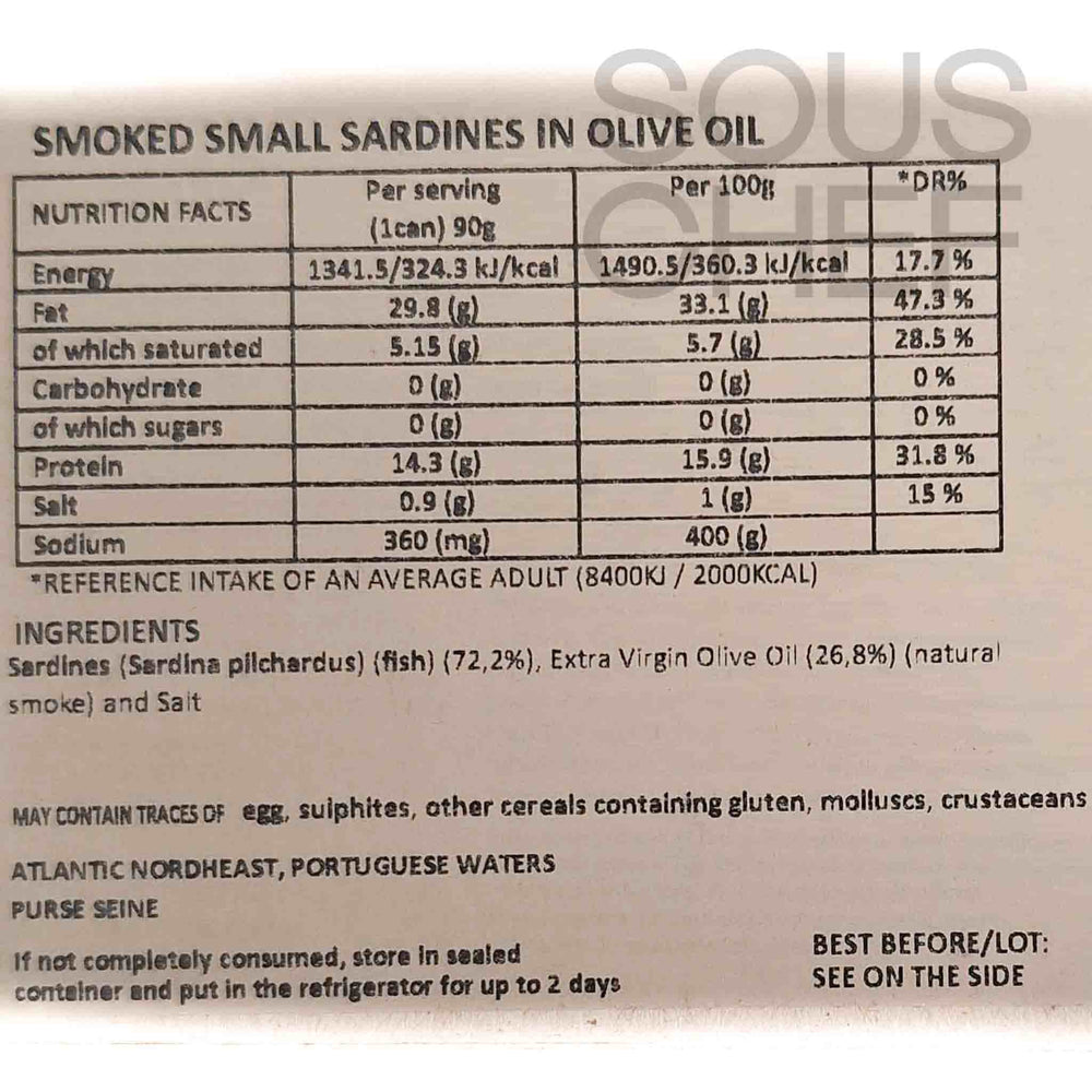 Product formulations and details may change. For the latest ingredients and allergen information always check product packaging prior to consumption. Ingredients: Sardines (sardina pilchardus) (fish), extra virgin olive oil (natural smoke), salt
