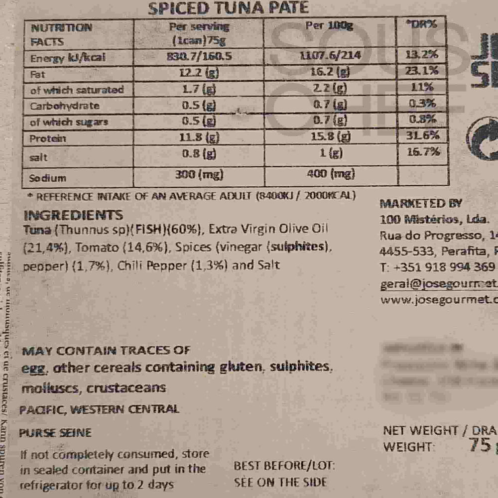 Product formulations and details may change. For the latest ingredients and allergen information always check product packaging prior to consumption. Ingredients: Tuna (katsuamo pelamis) (fish), extra virgin olive oil, tomato, spices, vinegar (sulphites), pepper, chilli pepper, salt. Contains sulphites.