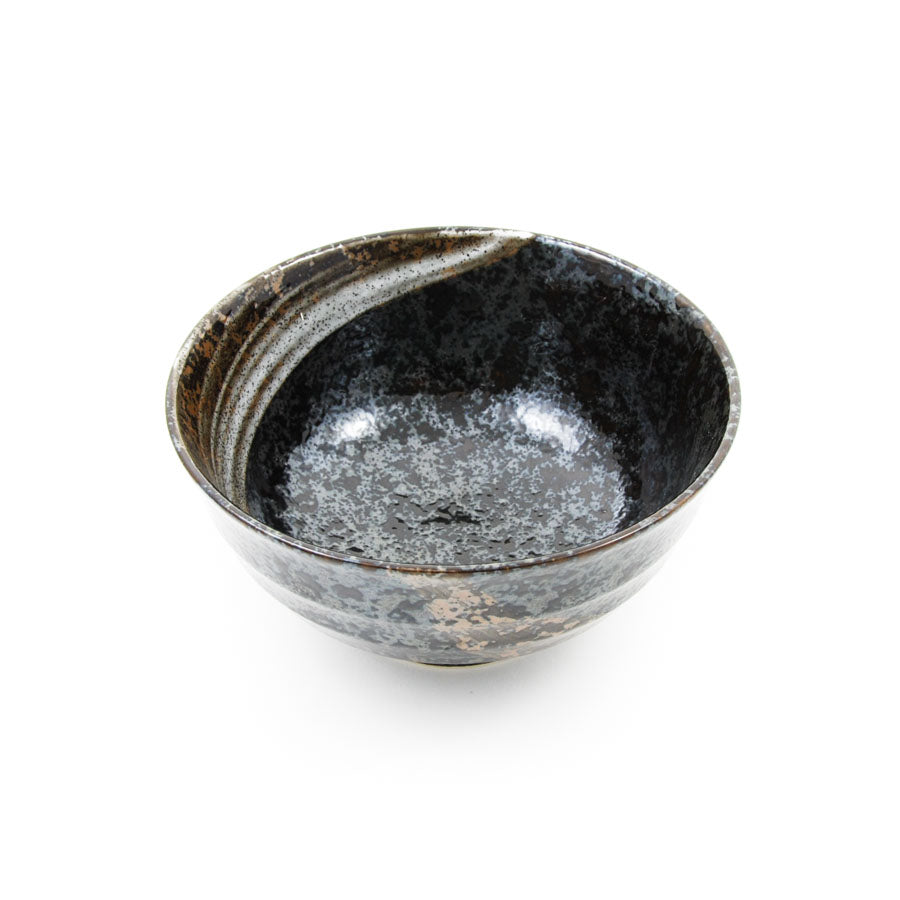 Karasuba-Iro means glossy black in Japanese, and this glazed ceramic ramen bowl has a beautiful glossy black and grey speckled surface. Additional red-brown detailing and white sweeps add to the elegance of the design.