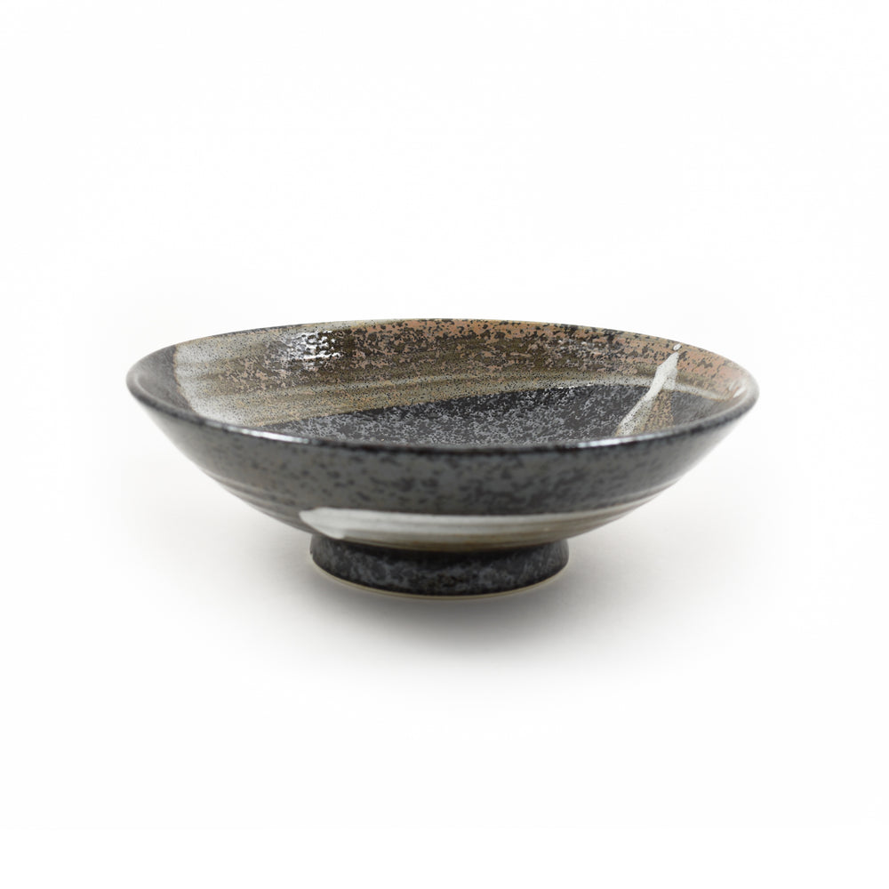 "Karasuba-iro" means glossy black in Japanese, and this glazed ceramic bowl has a beautiful glossy black and grey speckled surface. Additional red-brown detailing and white sweeps add to the elegance of the design.