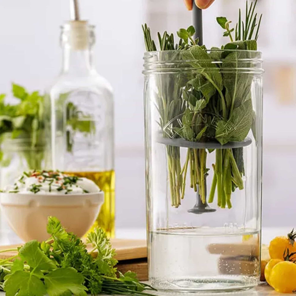 The Kilner® herb keeper keeps herbs fresh for up to three weeks. Trim their stems and keep them in filtered water in the glass jar. Herbs like mint, basil and coriander will stay at their best for longer.