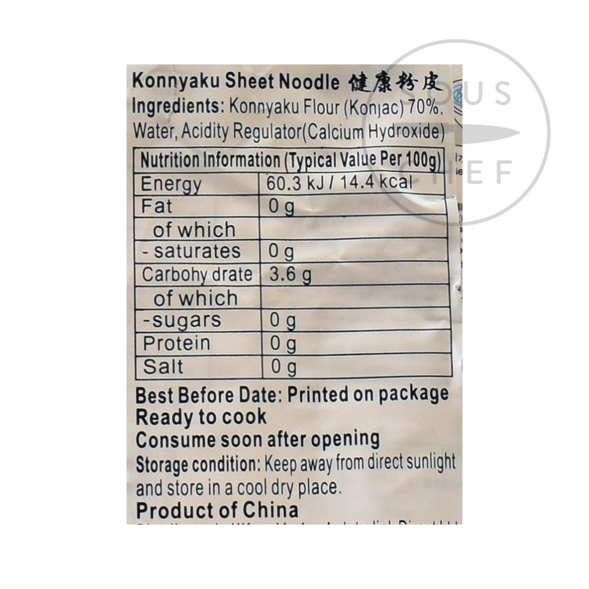 Product formulations and details may change. For the latest ingredients and allergen information always check product packaging prior to consumption. Ingredients: Konnyaku flour, water, acidity regulator (calcium hydroxide)