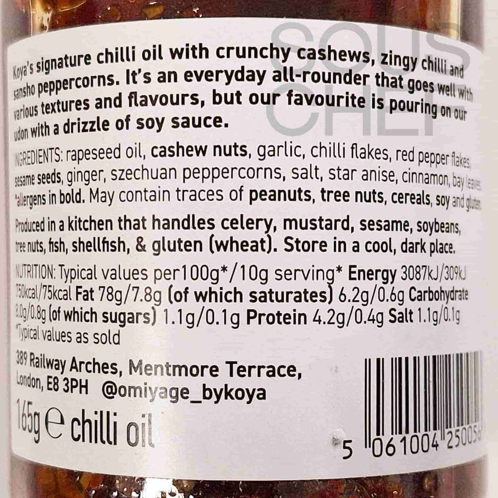 Koya flavours rapeseed oil with chilli flakes, ginger, garlic and star anise. Sansho peppercorns have a citrus flavour, while cashews and sesame seeds add texture. This oil is beautifully balanced with plenty of chilli heat.