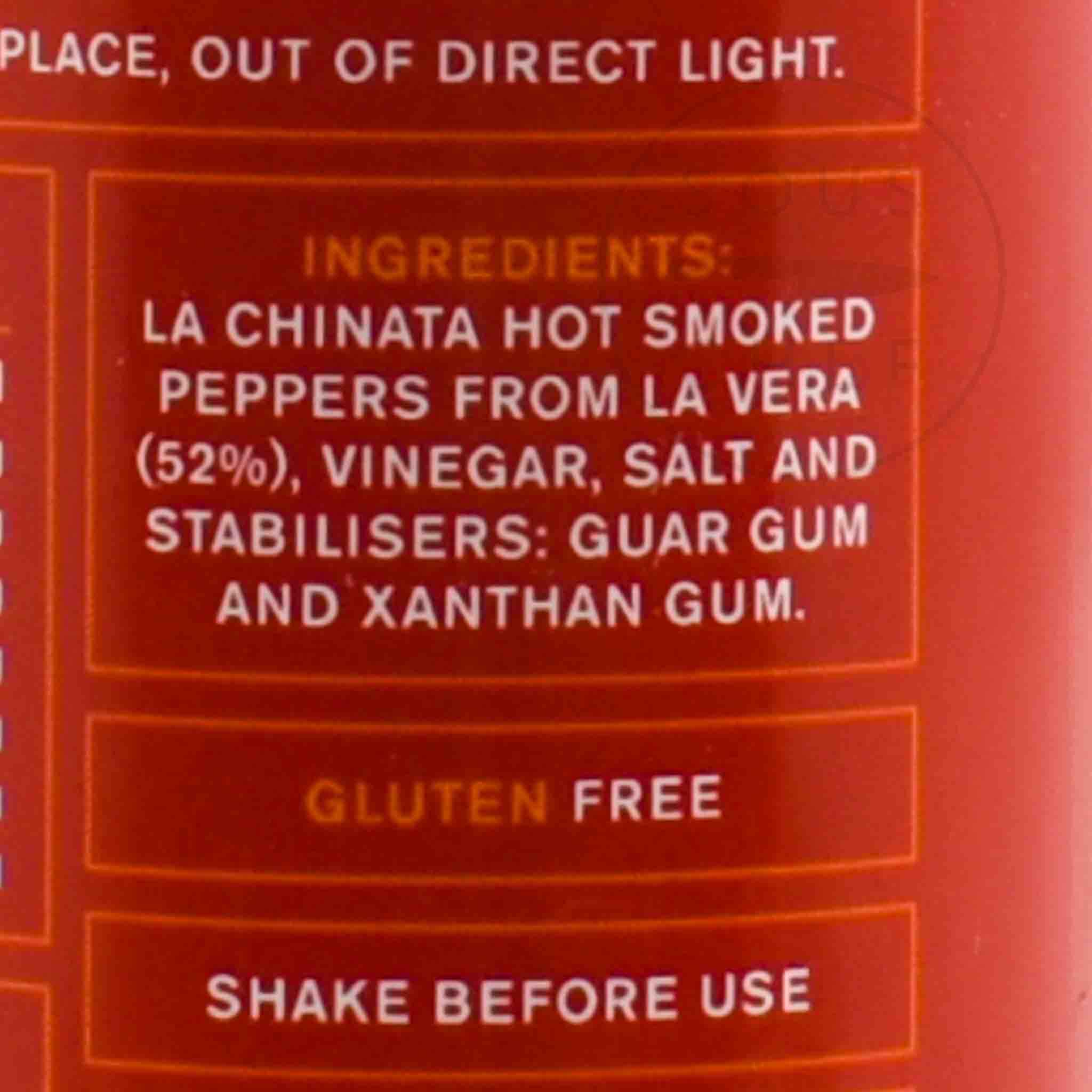 Product formulations and details may change. For the latest ingredients and allergen information always check product packaging prior to consumption. Ingredients: Smoked hot peppers (52%), vinegar, salt and stabilisers: guar gum and xanthan gum.