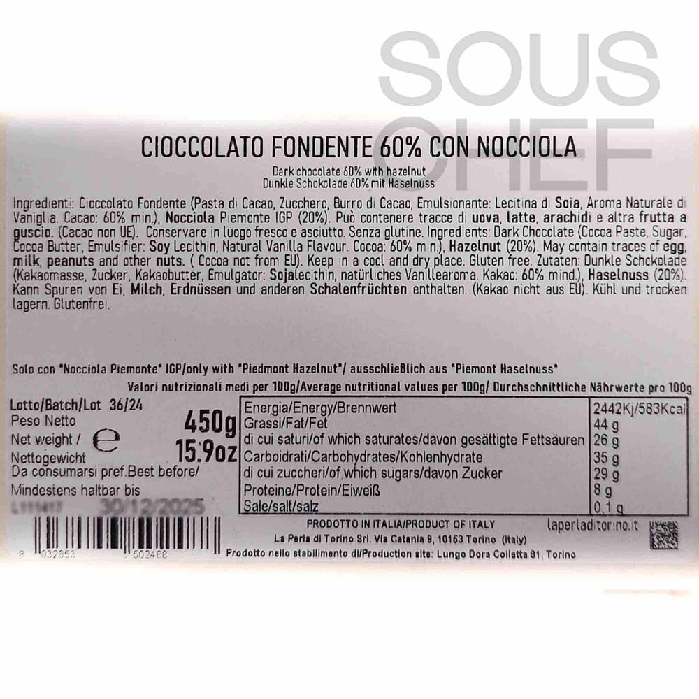 La Perla di Torino 60% Dark Chocolate Slab with Whole Roasted Hazelnuts, 450g