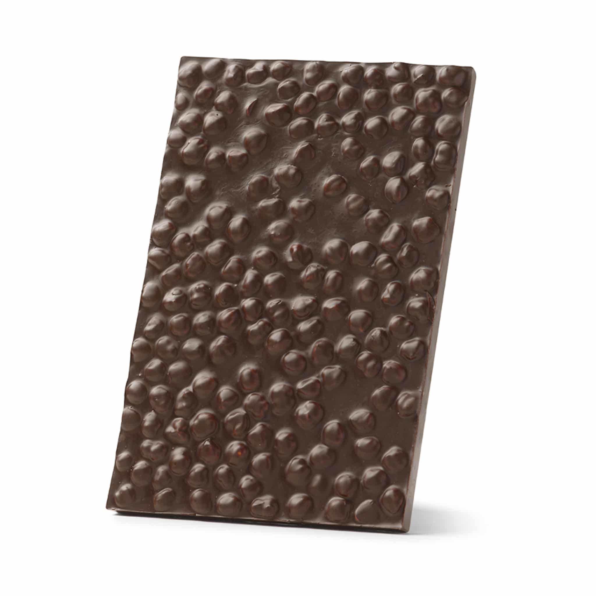 This dark chocolate slab is made with 60% chocolate. It has a defined cocoa flavour with notes of bittersweet acidity. The slab is studded with whole roasted hazelnuts.