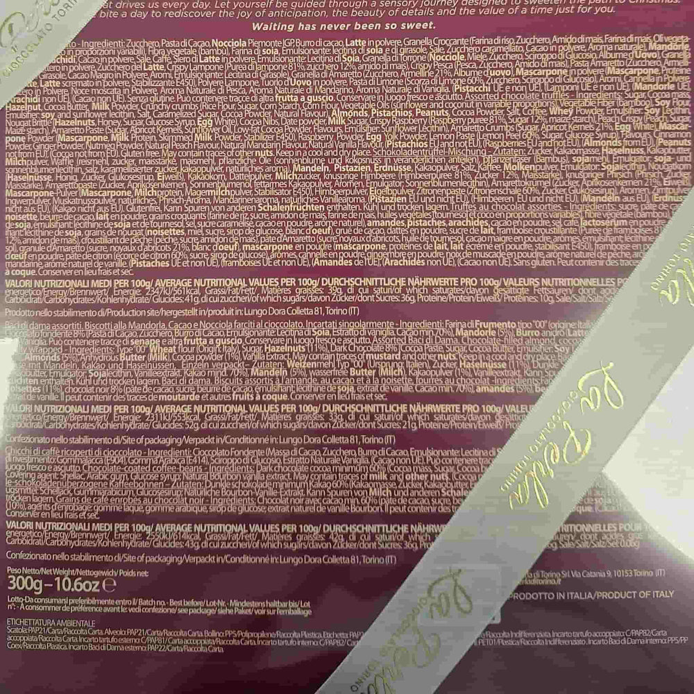 Product formulations and details may change. For the latest ingredients and allergen information always check product packaging prior to consumption. Ingredients: Assorted chocolate truffles - ingredients: sugar, cocoa mass, hazelnut, cocoa butter, milk powder, crunchy crumbs (rice flour, sugar, corn starch, corn flour, vegetable oils (sunflower and coconut in variable proportions), vegetable fiber (bamboo), soy flour, emulsifier: soy and sunflower lecithin, salt, caramelized sugar, cocoa powder, natural flavour), almonds, pistachios, peanuts, cocoa powder, salt, coffee, whey powder, emulsifier: soy lecithin, nougat brittle (hazelnuts, honey, sugar, glucose syrup, egg white), cocoa nibs, date powder, milk sugar, crispy raspberry (raspberry puree 81%, sugar 12%, maize starch), peach crispy (peach, sugar, maize starch), amaretto paste (sugar, apricot kernels, sunflower oil, low-fat cocoa powder, flavours, emulsifier: sunflower lecithin), amaretto crumbs (sugar, apricot kernels 21%, egg white), mascarpone powder (mascarpone, milk protein, skimmed milk powder, stabilizer e450), raspberry powder, egg yolk powder, lemon paste (lemon peel 60%, sugar, glucose syrup), flavours, cinnamon powder, ginger powder, nutmeg powder, natural peach flavour, natural mandarin flavour, natural vanilla flavour. assorted baci di dama. chocolate-filled almond, cocoa and hazelnut biscuits. individually wrapped - ingredients: type “00“ wheat flour (origin: italy), sugar, hazelnuts (11%), dark chocolate 8% (cocoa paste, sugar, cocoa butter, emulsifier: soy lecithin, vanilla extract. cocoa min. 70%), almonds (5%), anhydrous butter (milk), cocoa powder (1%), vanilla extract. chocolate-coated coffee-beans - ingredients: dark chocolate cocoa minimum 60% (cocoa mass, sugar, cocoa butter, emulsifier: soya lecithin), roasted coffee beans (10%), covering agent: shellac, arabic gum, glucose syrup; natural bourbon vanilla extract. Contains sulphites.
