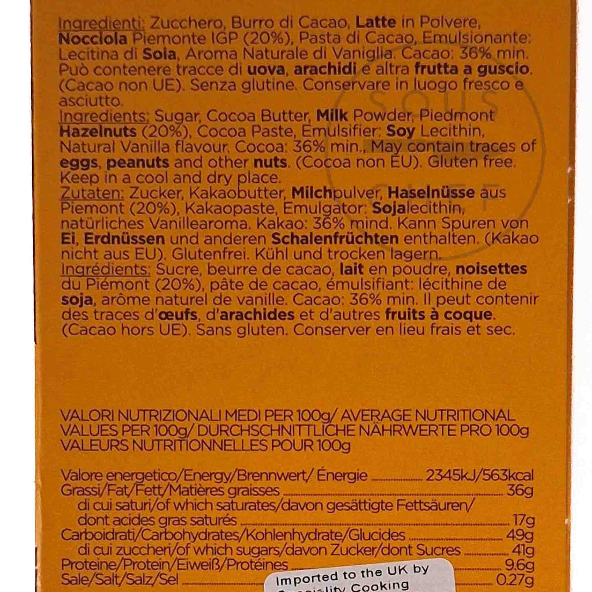 Product formulations and details may change. For the latest ingredients and allergen information always check product packaging prior to consumption. Ingredients: Sugar, cocoa butter, milk powder, hazelnuts (20%), cocoa paste, emulsifier: soy lecithin, natural vanilla flavour. cocoa: 36% min.,