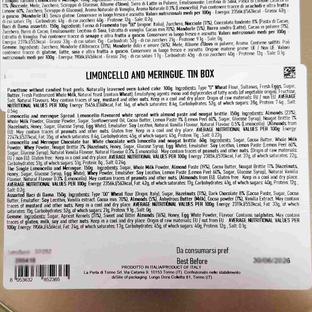 Product formulations and details may change. For the latest ingredients and allergen information always check product packaging prior to consumption. Ingredients: Panettoncino. ingredients: type "0" wheat flour, sultanas, fresh eggs, sugar, butter, fresh pasteurized whole milk, natural yeast (contain wheat), emulsifying agents: mono and diglycerides of fatty acids (of vegetable origin), fructose, salt, natural flavours. Limoncello and meringue spread. ingredients: almonds (23%), whole milk powder, glucose powder, sugar, sunflower seed oil, cocoa butter, lemon paste 1% (lemon peel 60%, sugar, glucose syrup), nougat brittle 1% (hazelnuts, honey, sugar, glucose syrup, egg white), emulsifier: soy lecithin, natural vanilla flavour, natural flavour 0.5% (limoncello). (almonds from eu). Limoncello and meringue bar. ingredients: sugar, cocoa butter, whole milk powder, whey powder, nougat brittle 3% (hazelnuts, honey, sugar, glucose syrup, egg white), emulsifier: soy lecithin, lemon paste (lemon peel 60%, sugar, glucose syrup), natural vanilla flavour, natural flavour 0.3% (limoncello). Chocolate truffle. ingredients: sugar, whole milk powder, almond paste (19%), cocoa butter, nougat brittle 11% (hazelnuts, honey, sugar, glucose syrup, egg white), whey powder, emulsifier: soy lecithin, lemon paste (lemon peel 60%, sugar, glucose syrup), natural vanilla flavour, natural flavour 0.3% (limoncello). (almonds from eu). Assorted baci di dama. ingredients: type “00“ wheat flour (origin: italy), sugar, hazelnuts (11%), dark chocolate 8% (cocoa paste, sugar, cocoa butter, emulsifier: soy lecithin, vanilla extract. cocoa min. 70%), almonds (5%), anhydrous butter (milk), cocoa powder (1%), vanilla extract. may contain traces of mustard and other nuts. Gemme. ingredients: sugar, apricot kernels (31%), sweet and bitter almonds (16%), honey, egg white powder, flavour. contains sulphites.