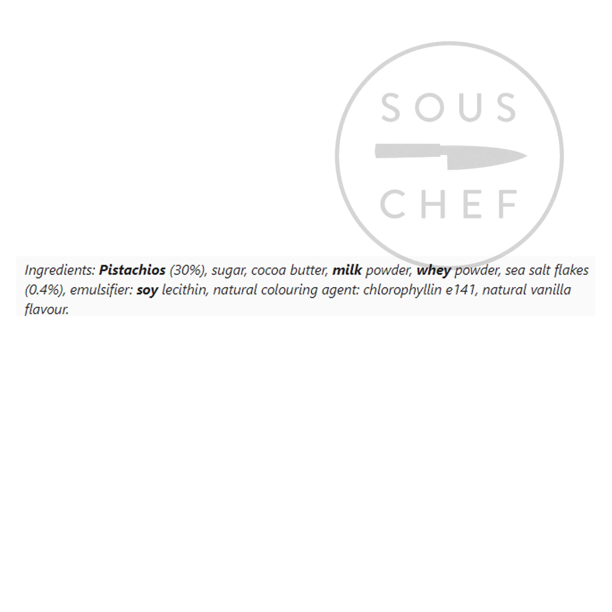 Product formulations and details may change. For the latest ingredients and allergen information always check product packaging prior to consumption. Ingredients: Pistachios (30%), sugar, cocoa butter, milk powder, whey powder, sea salt flakes (0.4%), emulsifier: soy lecithin, natural colouring agent: chlorophyllin e141, natural vanilla flavour.