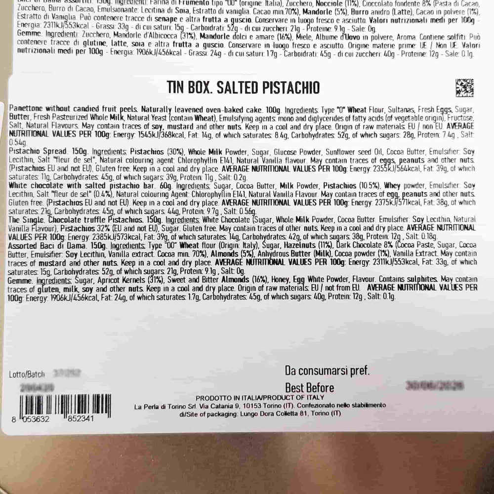 Product formulations and details may change. For the latest ingredients and allergen information always check product packaging prior to consumption. Ingredients: Panettoncino. ingredients: type "0" wheat flour, sultanas, fresh eggs, sugar, butter, fresh pasteurized whole milk, natural yeast (contain wheat), emulsifying agents: mono and diglycerides of fatty acids (of vegetable origin), fructose, salt, natural flavours. Pistachio spread: ingredients: pistachios (30%), whole milk powder, sugar, glucose powder, sunflower seed oil, cocoa butter, emulsifier: soy lecithin, salt "fleur de sel", natural colouring agent: chlorophyllin e141, natural vanilla flavour. Pistachio chocolate bar: ingredients: sugar, cocoa butter, milk powder, pistachios (10.5%), whey powder, emulsifier: soy lecithin, salt "fleur de sel" (0.4%), natural colouring agent: chlorophyllin e141, natural vanilla flavour. chocolate truffle. ingredients: white chocolate (sugar, whole milk powder, cocoa butter. emulsifier: soy lecithin, natural vanilla flavour), pistachios 32% (eu and not eu), sugar. Assorted baci di dama. ingredients: type “00“ wheat flour (origin: italy), sugar, hazelnuts (11%), dark chocolate 8% (cocoa paste, sugar, cocoa butter, emulsifier: soy lecithin, vanilla extract. cocoa min. 70%), almonds (5%), anhydrous butter (milk), cocoa powder (1%), vanilla extract. Gemme. ingredients: sugar, apricot kernels (31%), sweet and bitter almonds (16%), honey, egg white powder, flavour. Contains sulphites.