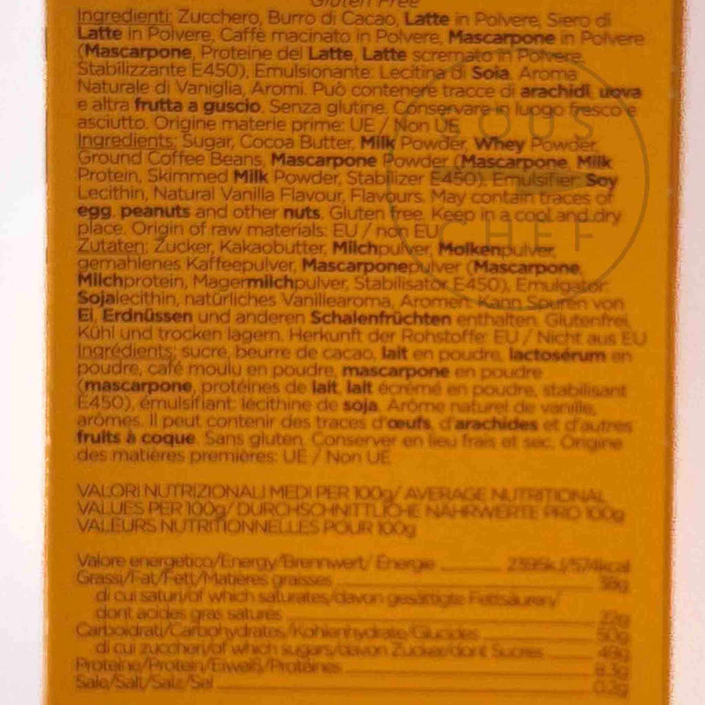 Product formulations and details may change. For the latest ingredients and allergen information always check product packaging prior to consumption. Ingredients: Sugar, cocoa butter, milk powder, whey powder, ground coffee beans 1.5%, mascarpone powder 1.5% (mascarpone, milk protein, skimmed milk powder, stabilizer e450), emulsifier: soy lecithin, natural vanilla flavour, flavours.