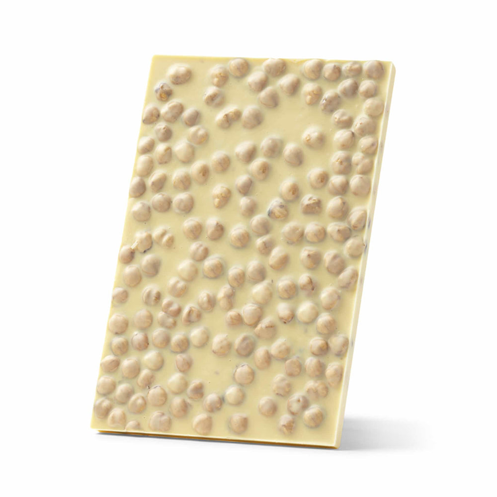 This white chocolate slab is studded with whole roasted hazelnuts. The toasty, earthy flavour of the nuts is a great match for sweet white chocolate. The slab is made in Turin by artisan chocolatiers, La Perla di Torino.