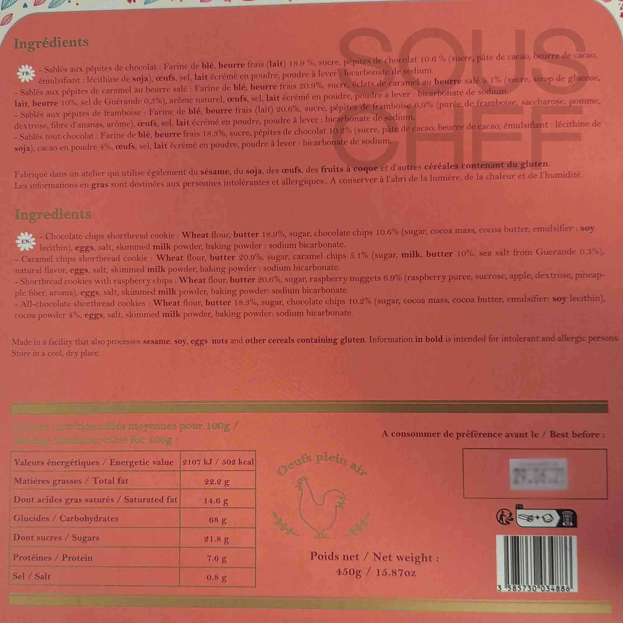 Caramel chips shortbread cookies : Wheat flour, butter (milk) 21%, sugar, caramel chips 5.2% (sugar, glucose syrup, milk, butter (milk) 10%, sea salt from Guerande 0.3%), natural caramel flavor, eggs, salt, skimmed milk powder, baking powder : sodium bicarbonate.