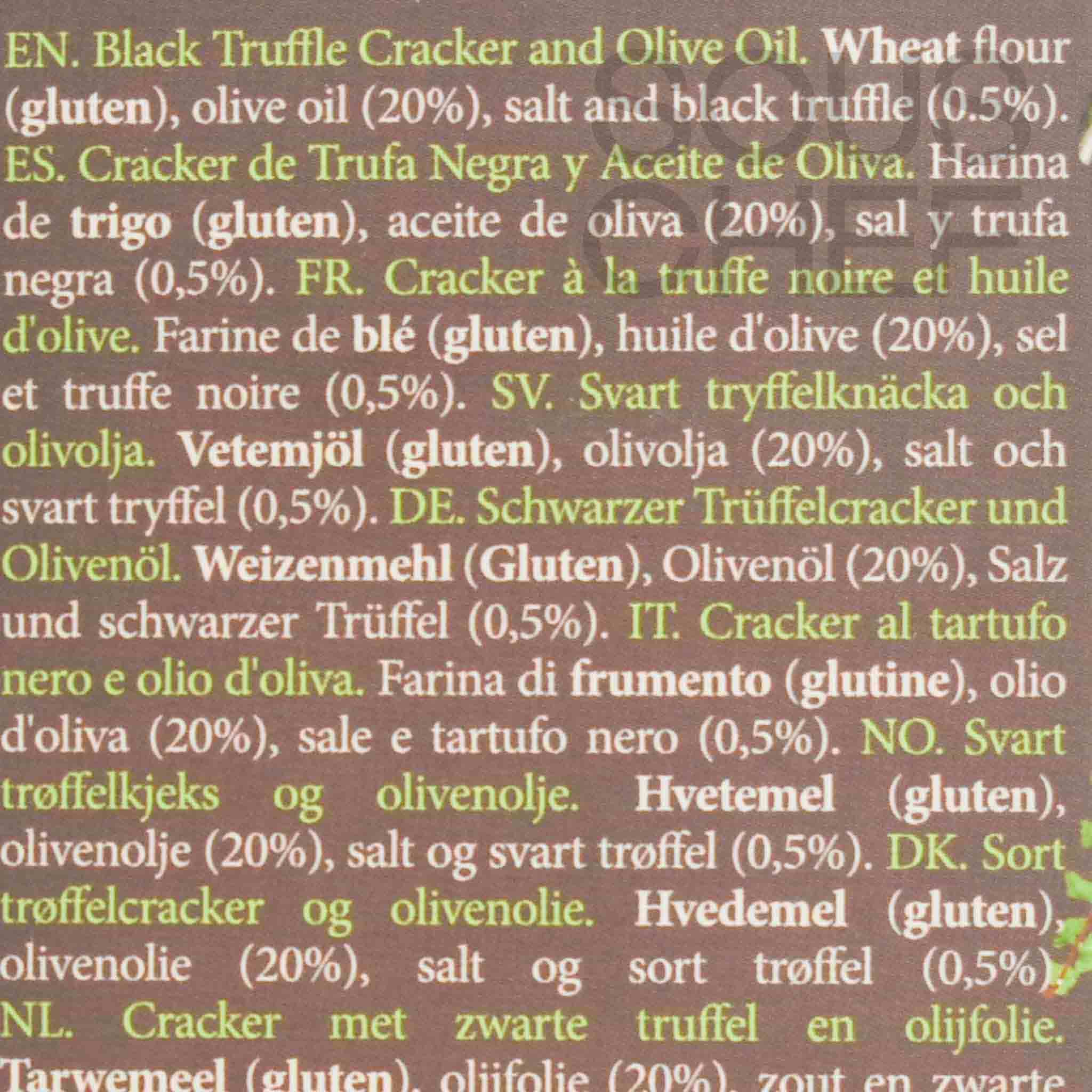 Product formulations and details may change. For the latest ingredients and allergen information always check product packaging prior to consumption. Ingredients: Wheat flour (gluten), olive oil, salt and black truffle