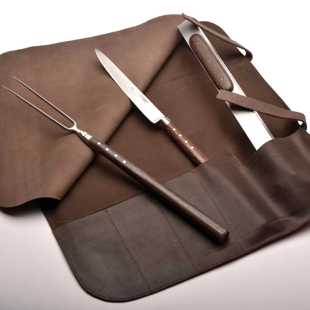 The barbecue set includes a leather roll for safe and stylish storage.