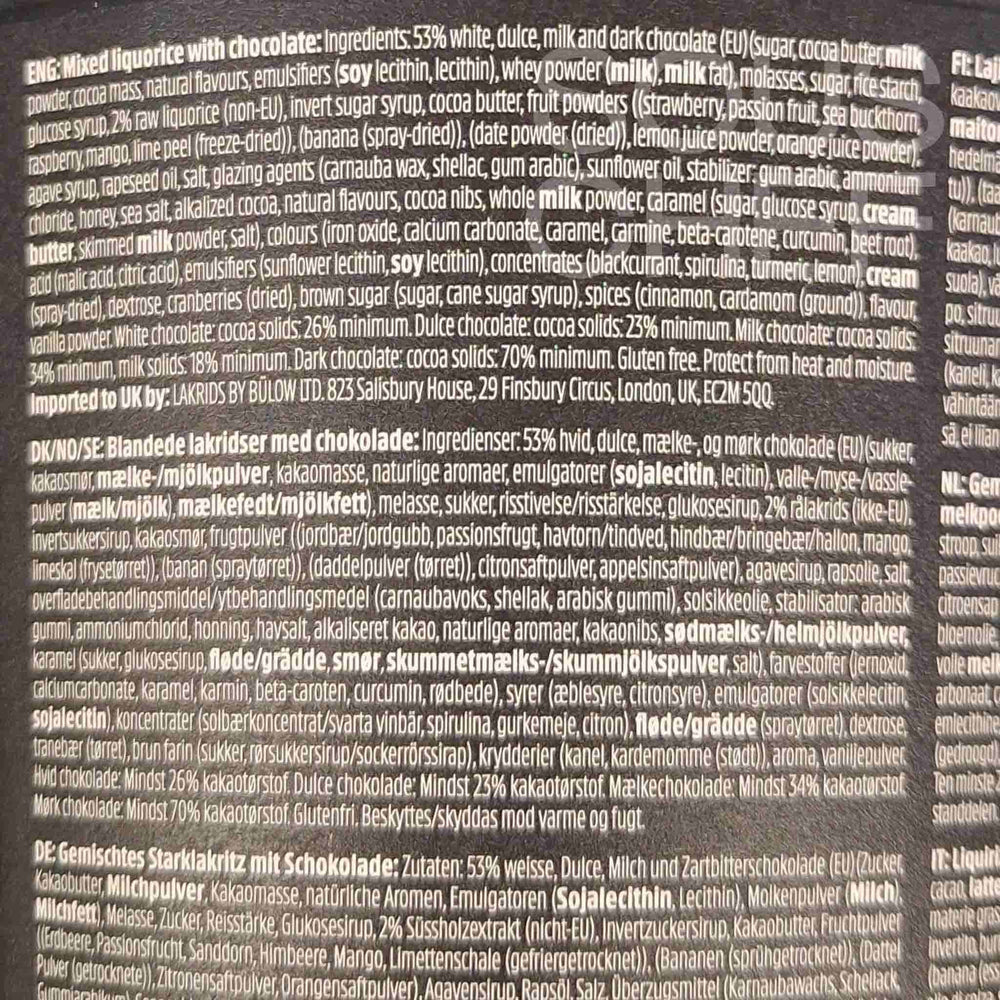 Product formulations and details may change. For the latest ingredients and allergen information always check product packaging prior to consumption. Ingredients: 53% white, dulce, milk and dark chocolate (EU)(sugar, cocoa butter, milk powder, cocoa mass, natural flavours, emulsifiers (soy lecithin, lecithin), whey powder (milk), milk fat), molasses, sugar, rice starch, glucose syrup, 2% raw liquorice (non-EU), invert sugar syrup, cocoa butter, fruit powders ((strawberry, passion fruit, sea buckthorn, raspberry, mango, lime peel (freeze-dried)), (banana (spray-dried)), (date (dried)), lemon juice powder, orange juice powder), agave syrup, rapeseed oil, salt, glazing agents (carnauba wax, shellac, gum arabic), sunflower oil, stabilizer: gum arabic, ammonium chloride, honey, sea salt, alkalized cocoa, natural flavours, cocoa nibs, whole milk powder, caramel (sugar, glucose syrup, cream (milk), butter (milk), skimmed milk powder, salt), colours (iron oxide, calcium carbonate, caramel, carmine, beta carotene, curcumin, beet root), acid (malic acid, citric acid), emulsifiers (sunflower lecithin, soy lecithin), concentrates (blackcurrant, spirulina, turmeric, lemon), cream (milk) (spray-dried), dextrose, cranberries (dried), brown sugar (sugar, cane sugar syrup), spices (cinnamon, cardamom (ground)), flavour, vanilla powder.