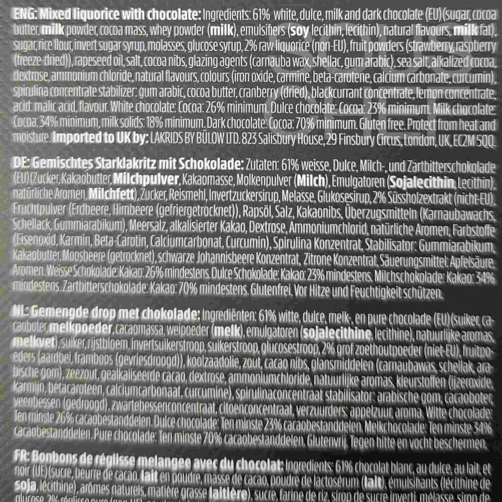 Product formulations and details may change. For the latest ingredients and allergen information always check product packaging prior to consumption. Ingredients: 61% dulce, white, milk and dark chocolate(eu_ (sugar, cocoa butter, milk powder, cocoa mass, whey powder (milk), emulsifiers (soy lecithin, lectithin), natural flavours, milk fat), sugar, rice flour, invert sugar syrup, molasses, gluecose syrup, 2% raw liquorice (non-eu), fruit powders (strawberry, raspberry (freeze-dried)), rapeseed oil, salt, cocoa nibs, glazing agents (carnauba wax, shellac, gum arabic), sea salt, alkalized cocoa, dextrose, ammonium chloride, natual flavours, colours (iron oxide, carmine, beta-carotene), stabilizer: gum arabic, cocoa butter. Dulce chocolate: cocoa: 23% minimum. White chocolate: cocoa: 26% minimum. Milk chocolate: cocoa: 34$ minimum, milk solids: 18% minimum. Dark chocolate: cocoa: 70% minimum. Gluten free.