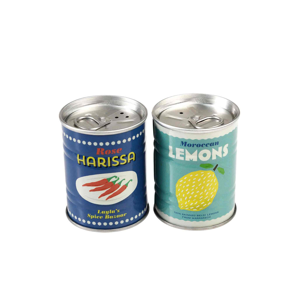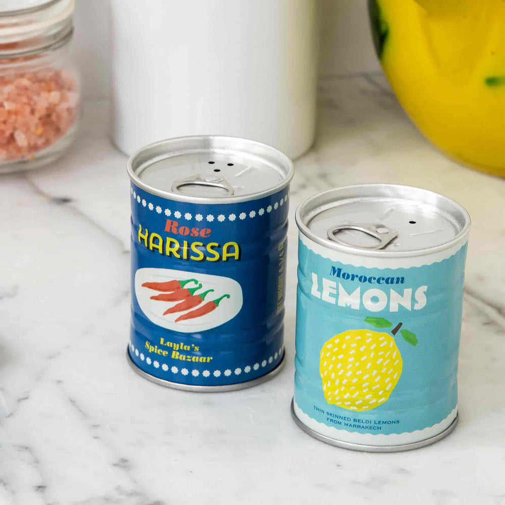 This lemon and harissa shaker set is a unique way to store your salt and pepper. The metal shakers are designed to look like little tins containing spicy harissa paste and tangy preserved lemons. They have a colourful, retro appeal that will add style and personality to your table. Display them on a shelf or counter when not in use so you can enjoy their lemon and chilli designs all day long.