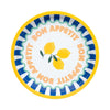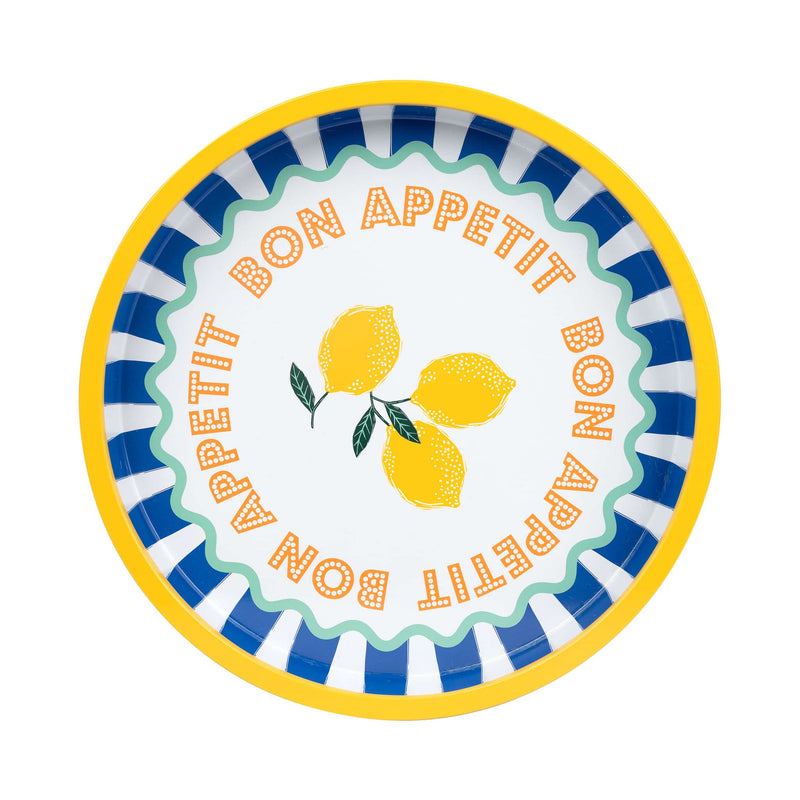 The tray has a coastal-inspired colour palette. It’s decorated with a lemon motif and blue striped border. There’s a sunshine yellow rim and coral text that reads ‘Bon Appetit’.