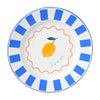 The plate has a blue and white striped rim. In the centre is a yellow lemon with dimpled skin and a delicate green leaf. It’s like a splash of sunshine for your home.