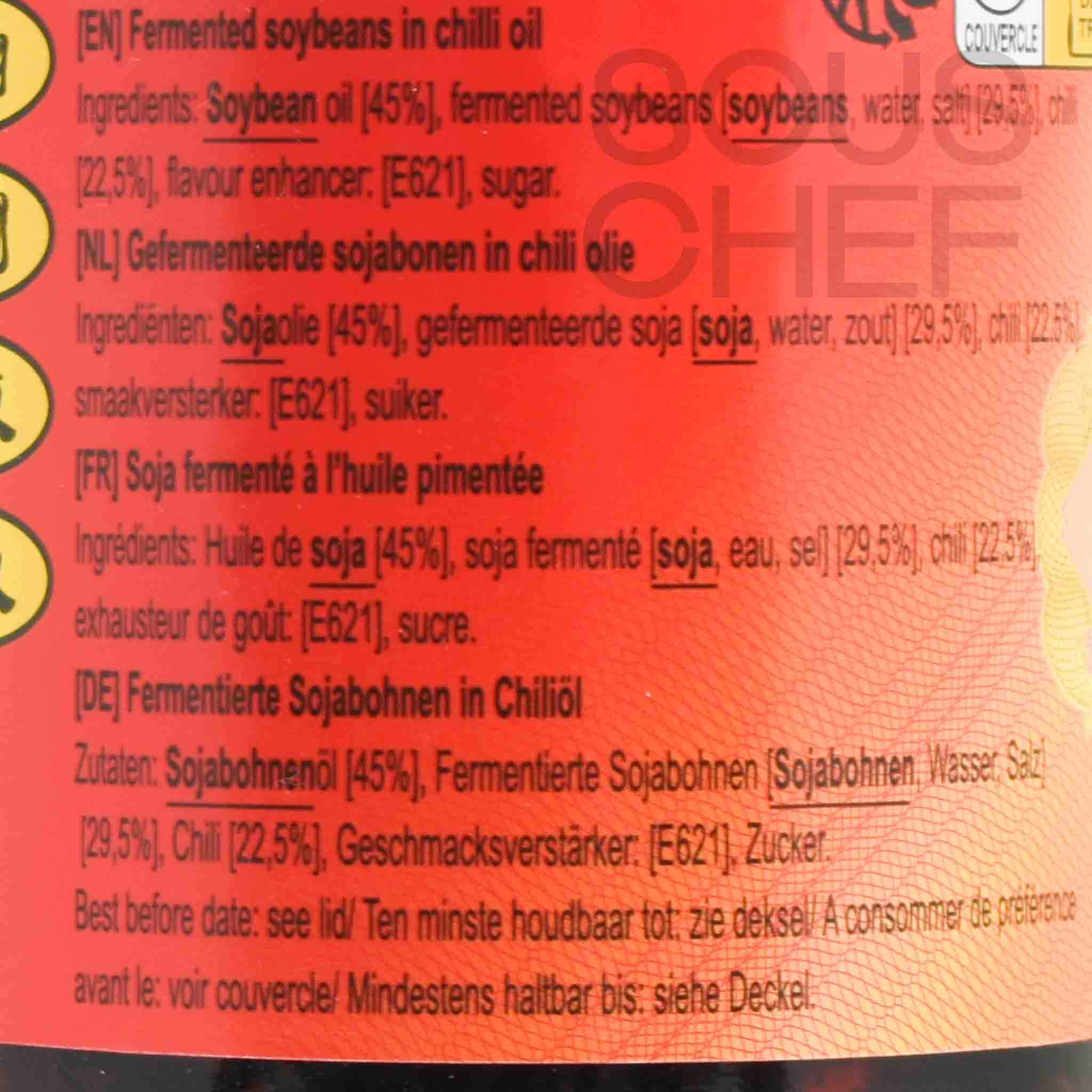 Product formulations and details may change. For the latest ingredients and allergen information always check product packaging prior to consumption. Ingredients: soybean oil (45%), fermented soybeans (soybeans, water, salt) (29.5%), chilli (22.5%), flavour enhancer (e621), sugar.