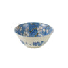 The glazed ceramic bowl is white and blue on the outside, with a blue interior that is decorated with a traditional Japanese blossom design.