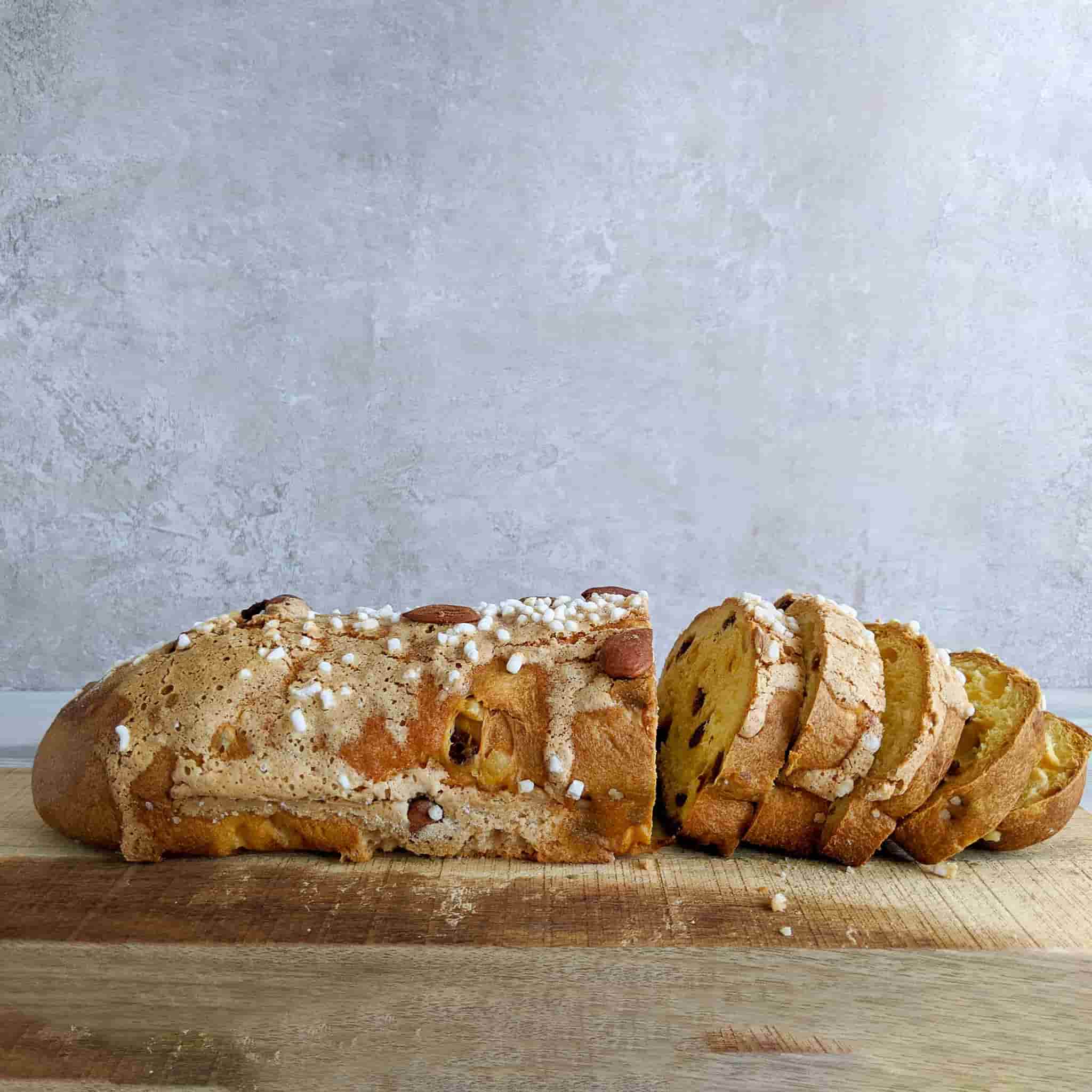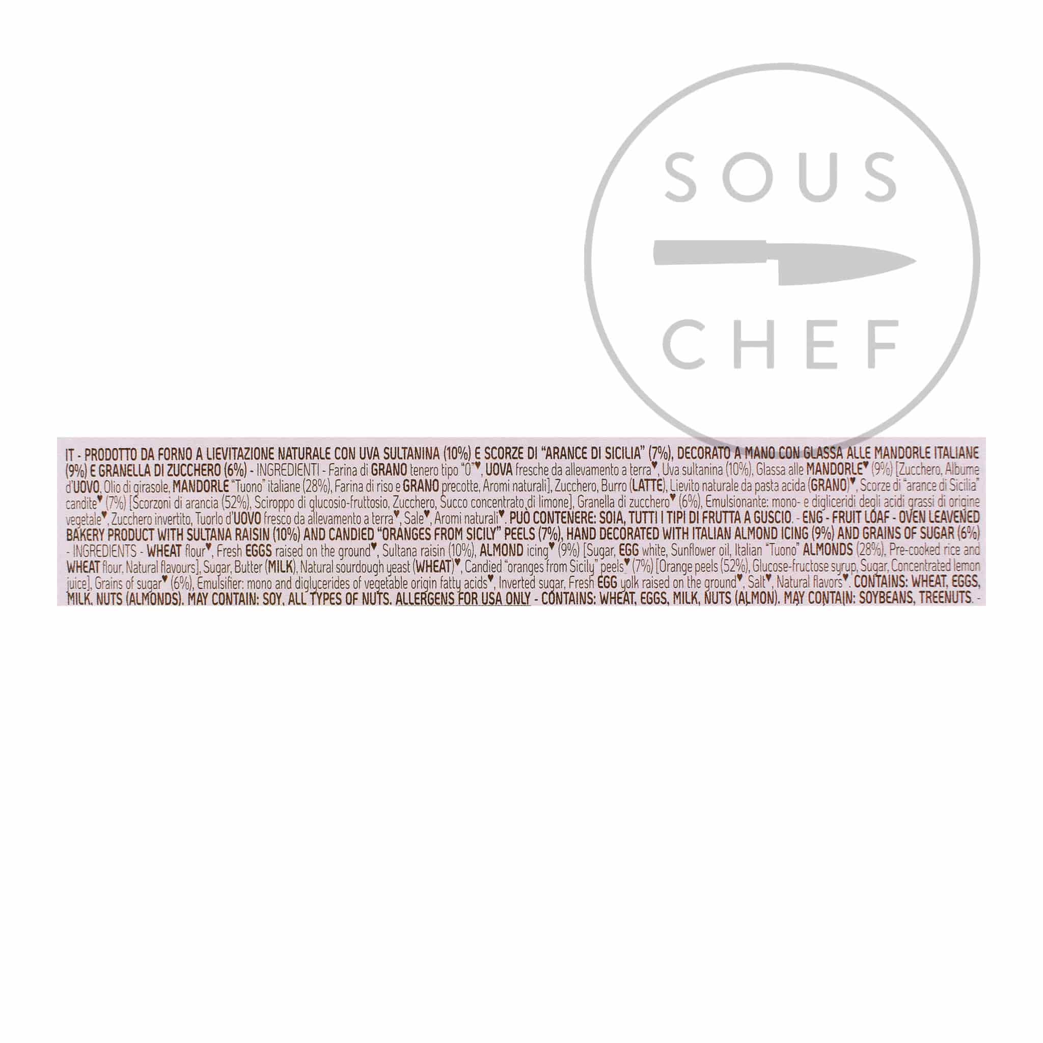 Product formulations and details may change. For the latest ingredients and allergen information always check product packaging prior to consumption. Ingredients: Wheat flour, fresh eggs raised on the ground, sultana raisin (10%), almond icing (9%) [sugar, egg white, sunflower oil, Italian "Tuono" almonds (28%), pre-cooked rice and wheat flour, natural flavours], sugar, butter (milk), natural sourdough yeast (wheat), candied “oranges from Sicily” peels (7%) [orange peels (52%), glucose-fructose syrup, sugar, concentrated lemon juice], grains of sugar (6%), emulsifier: mono and diglycerides of vegetable origin fatty acids, inverted sugar, fresh egg yolk raised on the ground, salt, natural flavours.