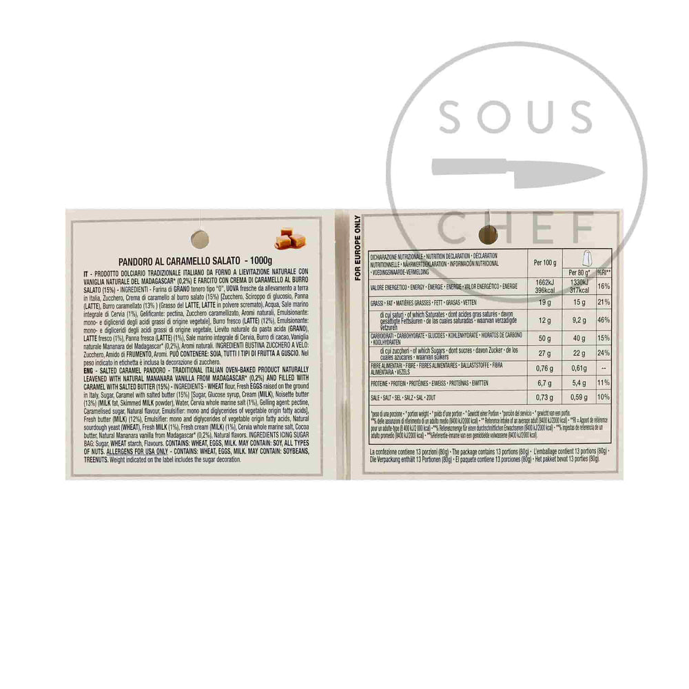 Product formulations and details may change. For the latest ingredients and allergen information always check product packaging prior to consumption. Ingredients for salted caramel pandoro: Wheat flour, Sugar, Fresh eggs raised on the ground in Italy, Caramel with salted butter (15%) [Sugar, Glucose syrup, Water, Noisette butter (milk) (13%), Cream (milk), Cervia whole marine salt (1%), Gelling agent: pectine, Caramelised sugar (0,45%), Natural flavor, Emulsifier: mono and diglycerides of vegetable origin fatty acids], Fresh butter (milk) (14%), Fresh egg yolk raised on the ground in Italy, Natural sourdough yeast (wheat), Emulsifier: mono and diglycerides of vegetable origin fatty acids, Fresh milk (1%), Fresh cream (milk) (1%), Cervia whole marine salt, Cocoa butter, Natural Mananara vanilla from Madagascar* (0,2%), Natural flavors. Ingredients icing sugar bag: Sugar, wheat starch, Natural flavors.