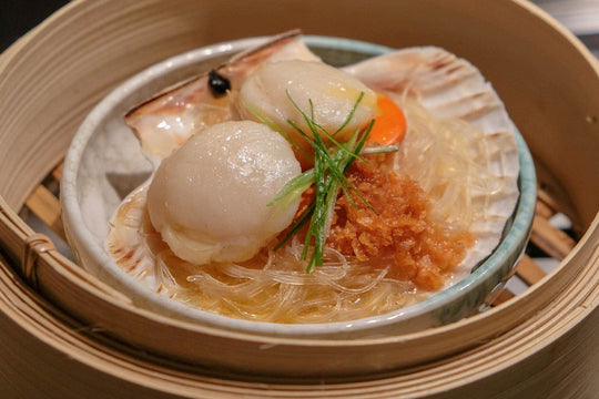 • Steamed scallops with glass noodles and fried garlic