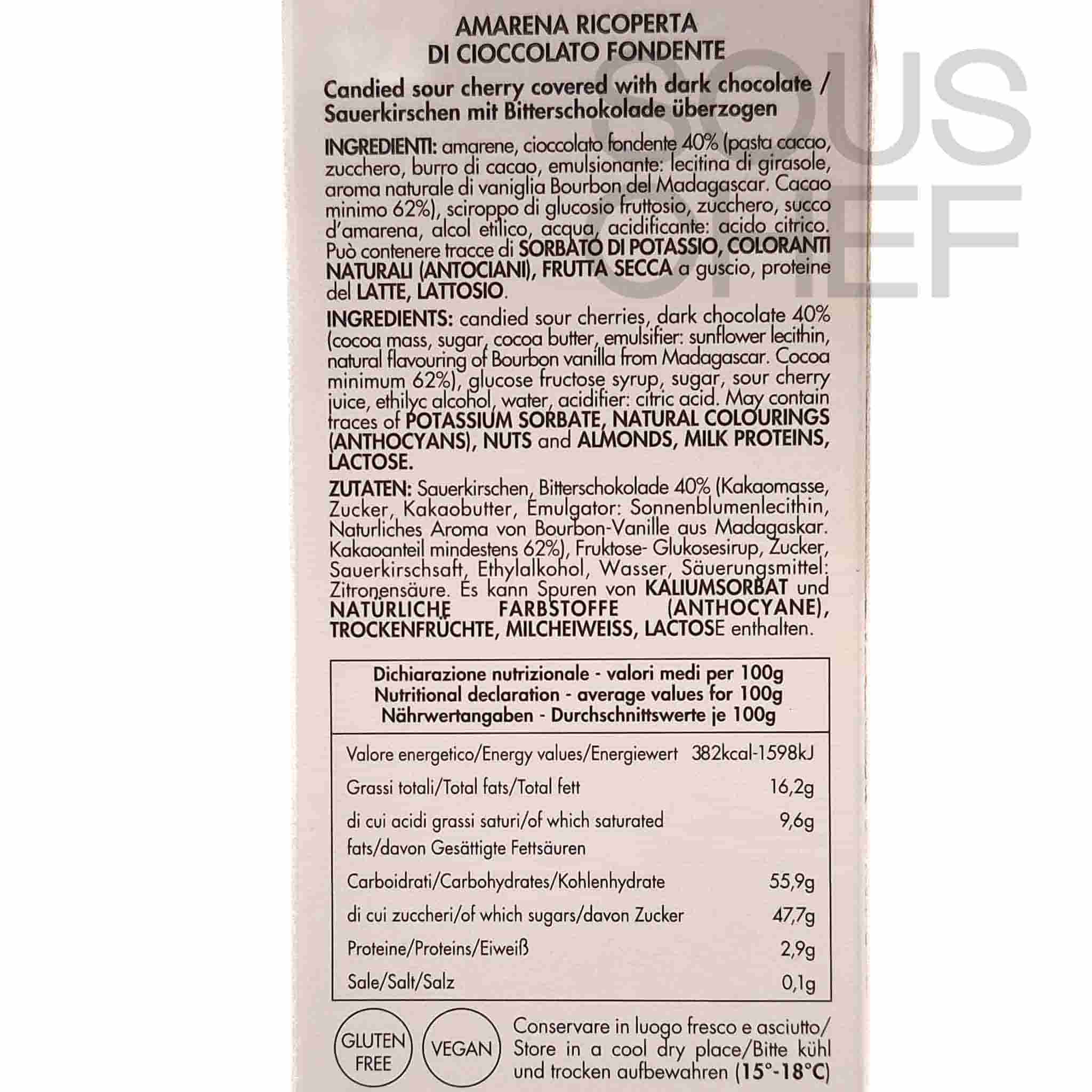 Product formulations and details may change. For the latest ingredients and allergen information always check product packaging prior to consumption. Ingredients: Candied sour cherries, 40% dark chocolate (cocoa mass, sugar, cocoa butter, emulsifier: sunflower lecithin, natural flavouring of bourbon vanilla from madagascar. Cocoa minimum 62%), glucose syrup, fructose, sugar, sour cherry juice, ethylic alcohol, water, acidifier: citric acid.