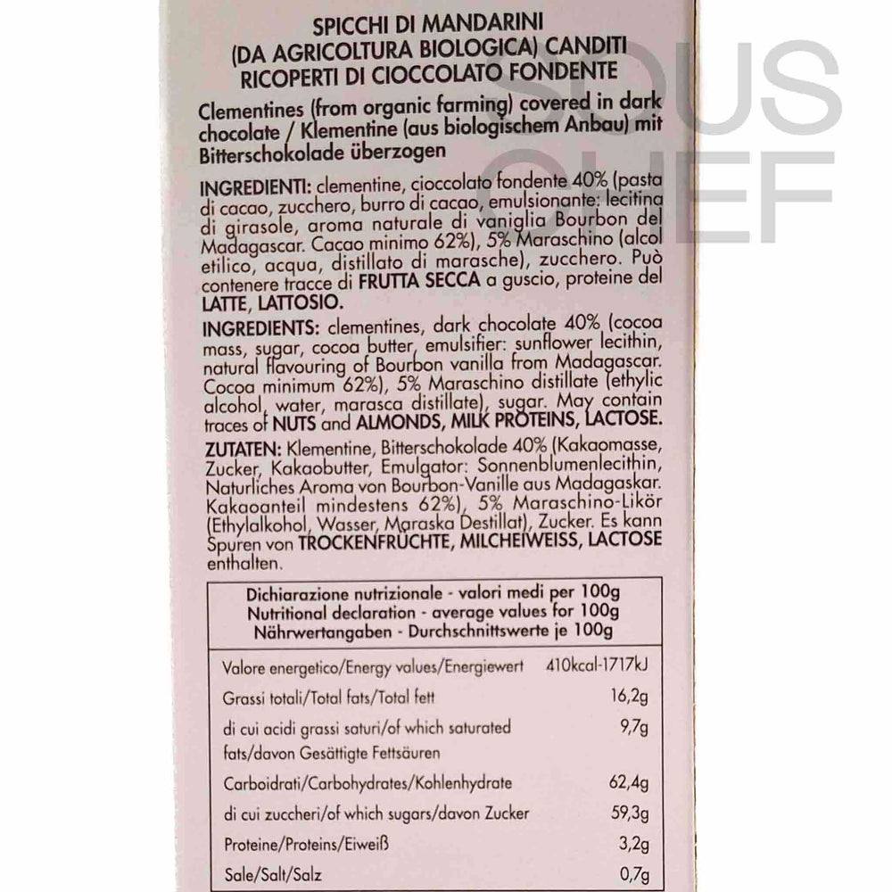 Product formulations and details may change. For the latest ingredients and allergen information always check product packaging prior to consumption. Ingredients: Clementines (from organic farming), dark chocolate covering 40% (cocoa mass, sugar, cocoa butter, emulsifier: sunflower lecithin, natural flavouring of bourbon vanilla from madagascar. cocoa minimum 62%), %), 5% maraschino distillate (water, ethylic alcohol, marasca distillate, sugar).
